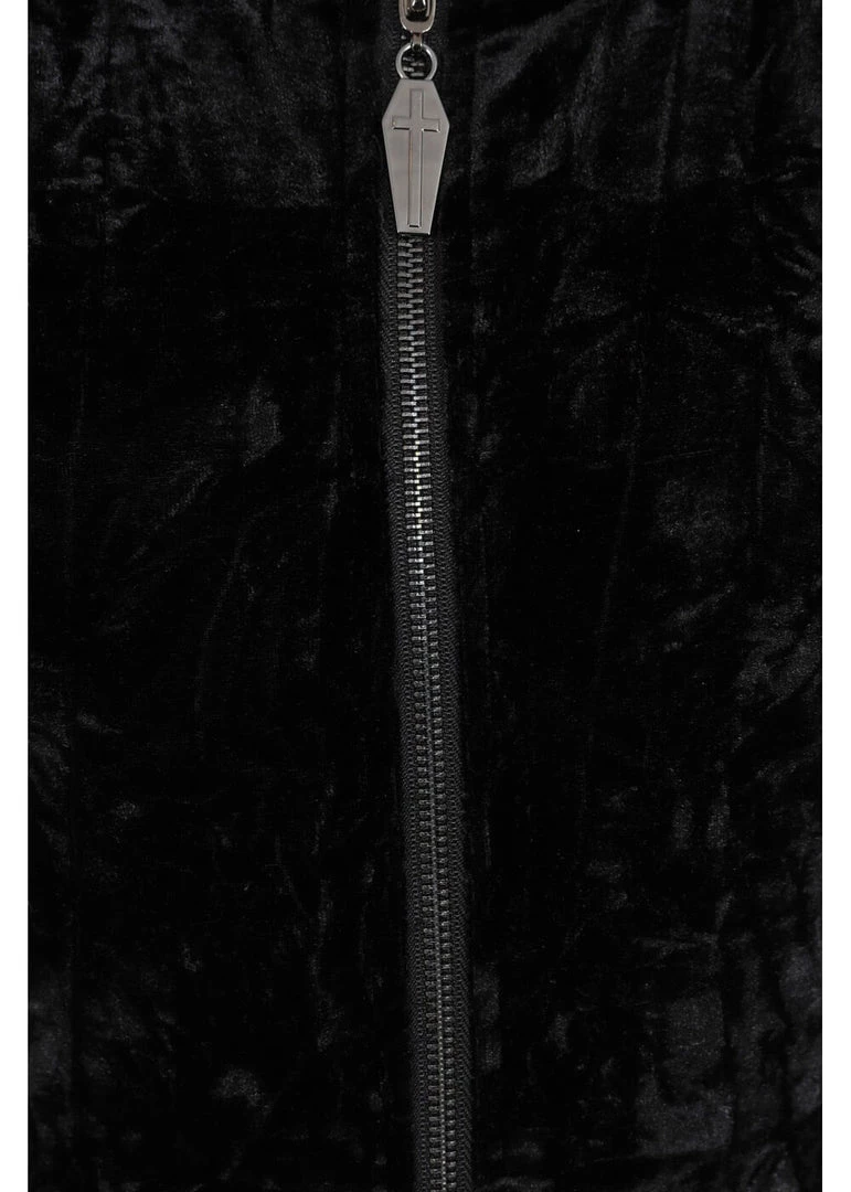 We’ve got a Big Crush on this soft cutie, with her big pointy hood that is adorned with a satin lacing in the back! The long sleeves flare slightly and she’s made of soft velvet with stretch that is delicate to wear. She closes with a zipper all over the front, decorated with a coffin. For a height of 1,70m she ends far above the knees, a real 60’s length.