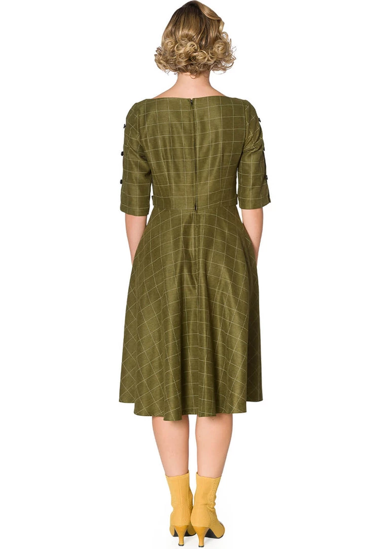 From the waist, she flares into a full skirt with pockets and an underskirt so nothing is itchy. She closes with a zipper in the back and for a height of 1,70m she ends just below the knees.