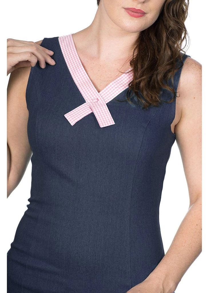 Her denim look is a mix of cotton and has a lovely stretch. Perfect for wearing when you’re eating at a picnic, or at a rockabilly party of course, because with her gingham accents she’s stunning anywhere. This cutie is beautifully formfitting because of her princess seams, down from which she continues into a Vavavoom pencil skirt which with a height of 1,70 reaches down to the knee. She closes with a zipper on the back.