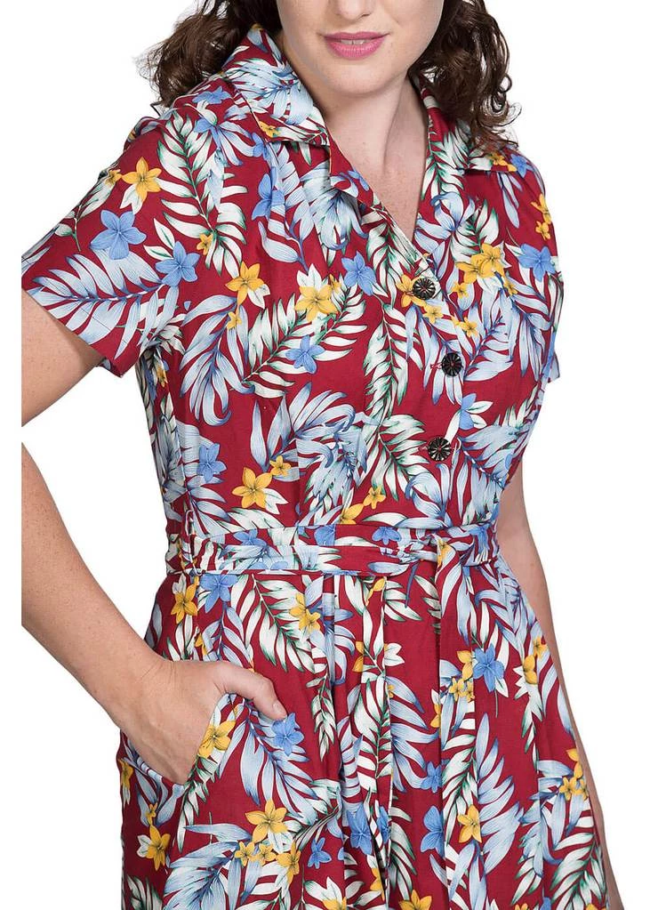 In between the tropical flowers there’s so many lovely details to be spotted, from the collar, to the folded sleeves, to the pleats on the shoulders to the playful buttons on the front! The flat pleats on the shoulders, as well as above and underneath the waistline give her that perfect 40s blouse look. The waist is accentuated by a loose sash, down from which she flares out into a playful a-line skirt with pockets. Her woven cotton with no stretch feels lovely and airy to wear. She closes with a zipper on the back and with a height of 1,70 she reaches down below the knees.