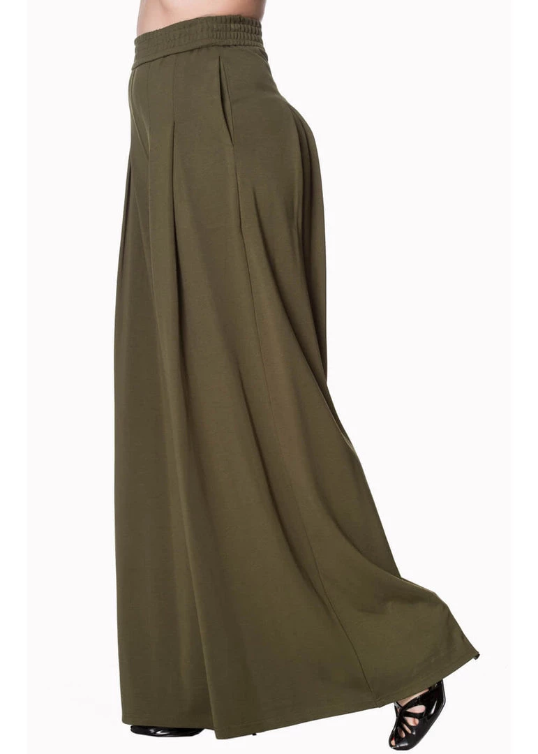 These palazzo trousers have an elastic waistline to ensure max comfort and instantly flares out into wide trouser legs. Because of the pleats by the hips the legs are even more flowy! She closes with a zipper on the back and with a height of 1,70 she almost reaches the floor. She’s made of a thicker, flexible fabric with stretch. Who can resist such a relaxed and stylish pair of trousers, with pockets to be exact?