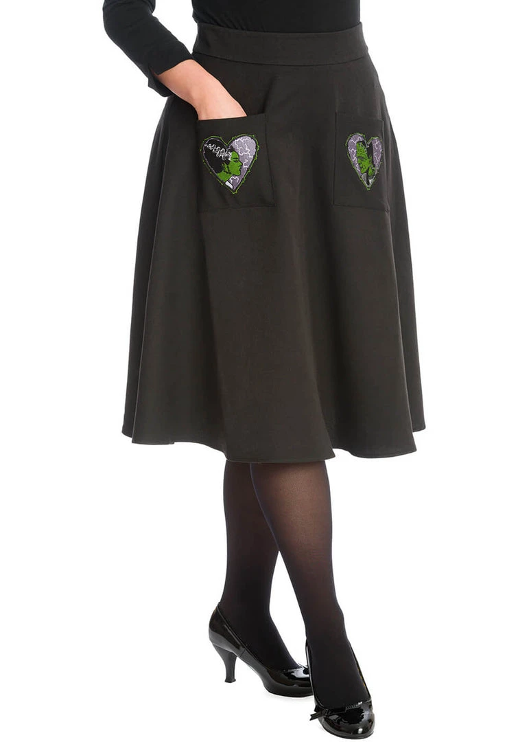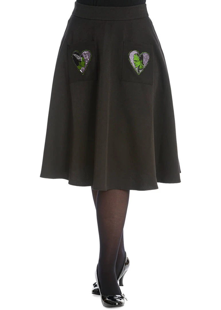 Frankenstein’s monster and its bride, both are displayed on the pockets on the front…