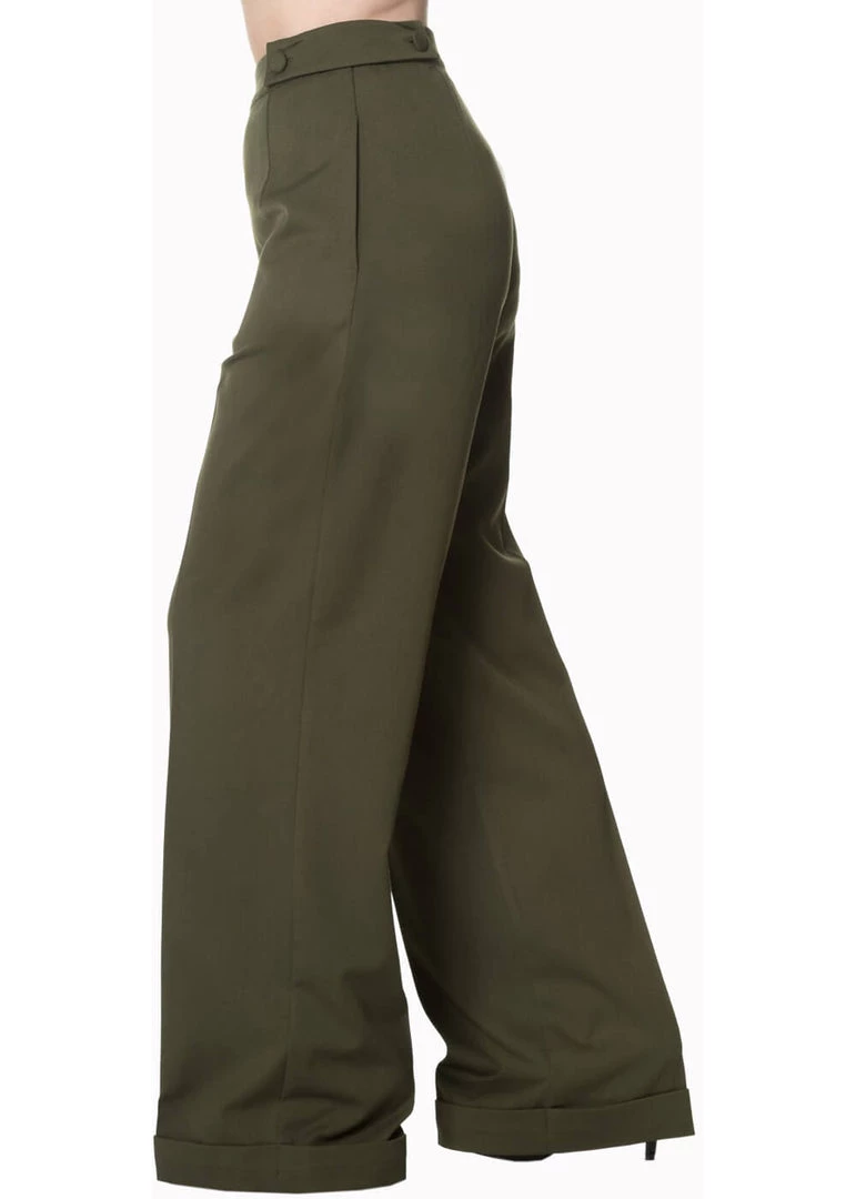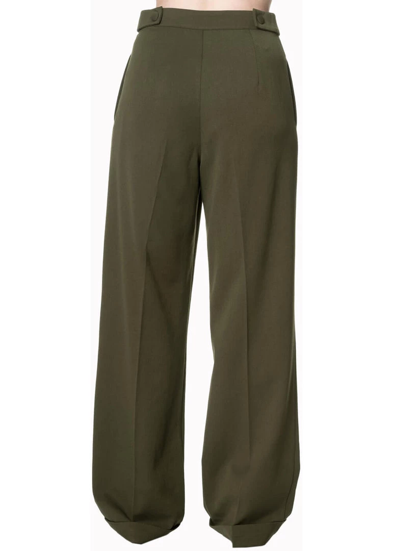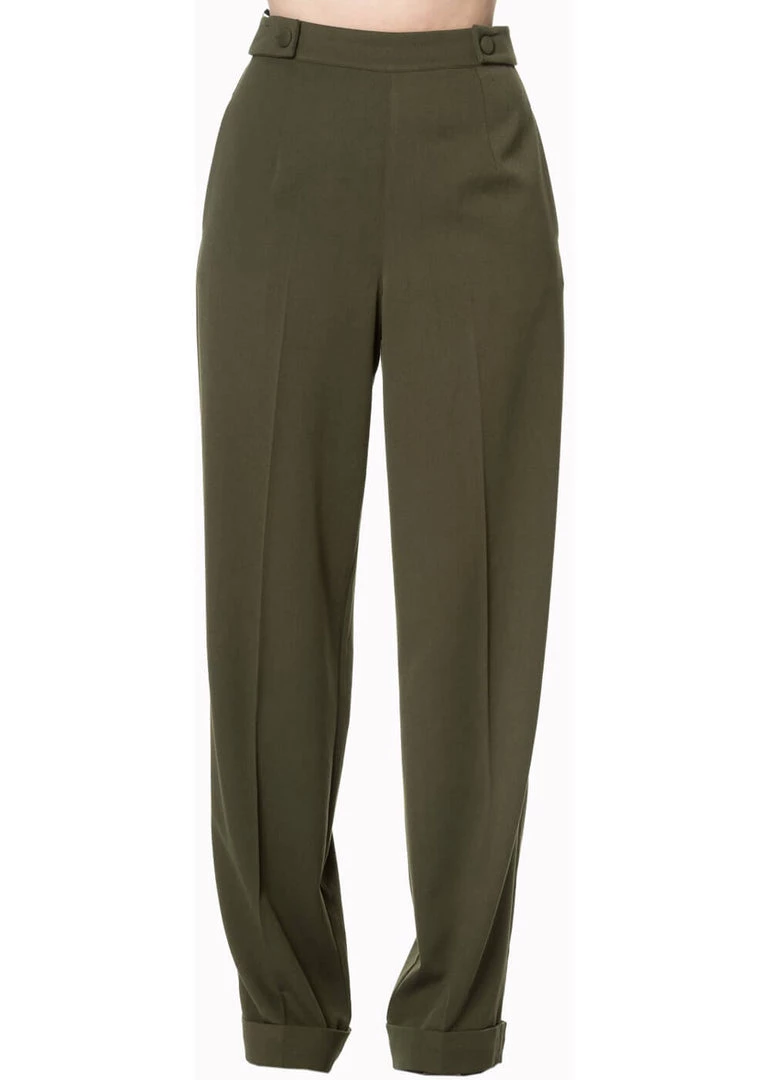 Her high waist is adorned with decorative buttons on the sides, where she also closes with a zipper. Pockets and fake-pockets on the bottom are a must, and the trouser legs have creases and rolled-up seams to make your legs look endless.