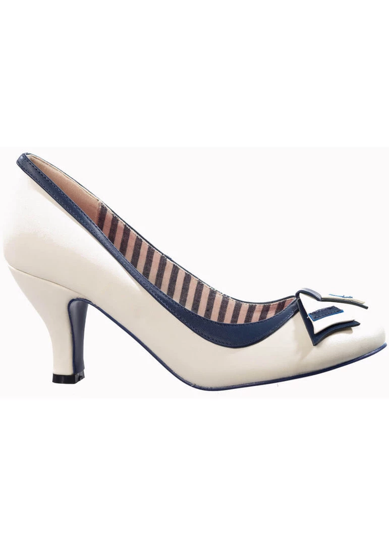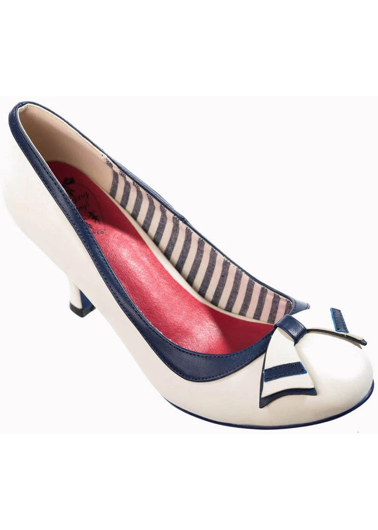 Deze beauty’s hebben een speelse jaren ’60 look door een het nautical detail op de neus en is gemaakt van een mooie kwaliteit kunstleder. Met de licht gebogen hak die met 6,5 cm niet al te hoog is loopt ze heerlijk, al helemaal met dat zachte voetenbed en katoenen voering. Dit fijne modelletje is geschikt voor bredere voeten.