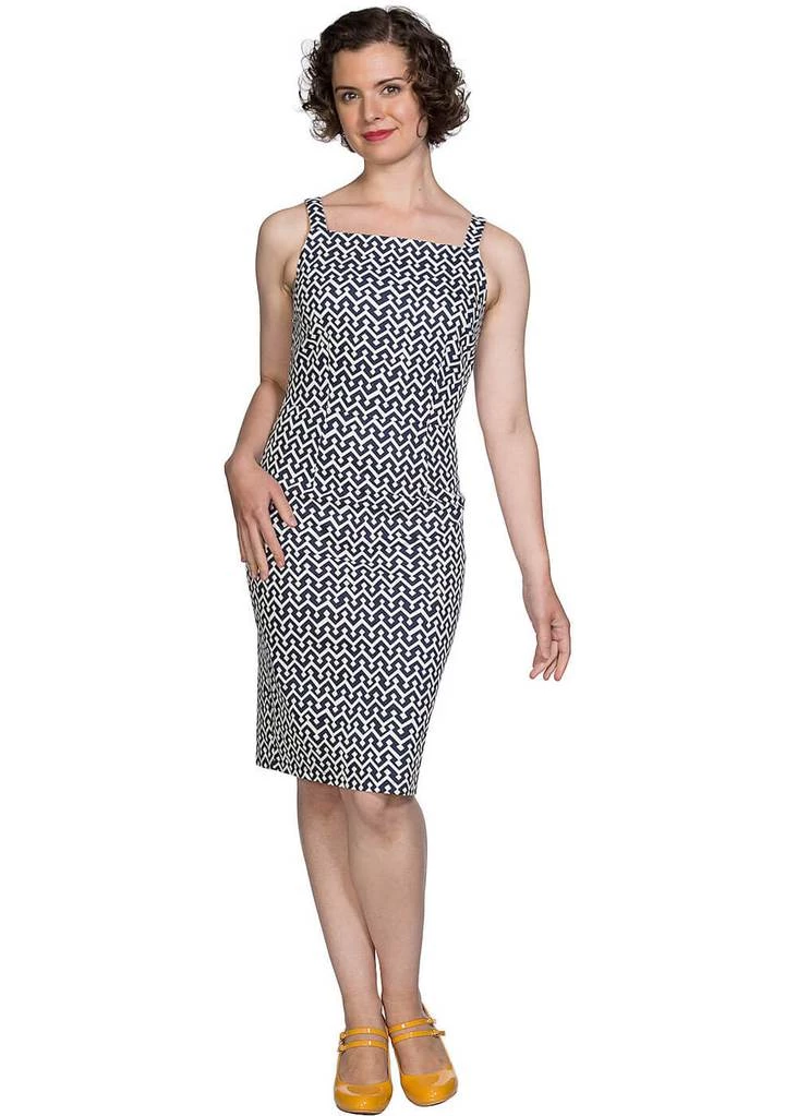 The dark blue is very striking against the white background, they look like tiles! The waist is accentuated by an attached sash, which is pre tied for you. No worries! She then continues into a playful pencil skirt which with a height of 1,70 reaches down to above the knee. This southern beauty is made of a beautiful quality cotton mix with a slight stretch, making her gorgeously formfitting. She closes with a zipper on the back where she also has a slit.