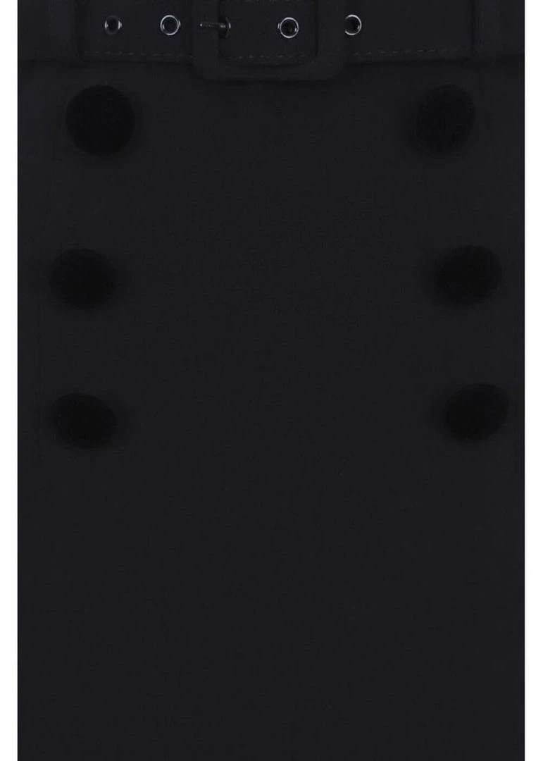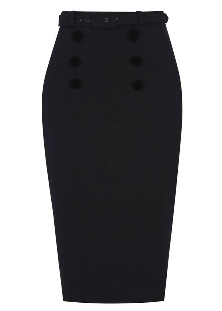 This cutie has just that little extra with those gorgeous velvet covered buttons, which transform even the simplest blouse or pullover into a dream look! The waist is accentuated with a velvet, loose belt, down from which she flares out into a vavavoom pencil skirt. With a height of 1,70 she reaches down to the knee and closes with a zipper on the back where she also has a slit. She is made of a beautiful fabric with a slight stretch and has a wine red lining to serve as the cherry on top.