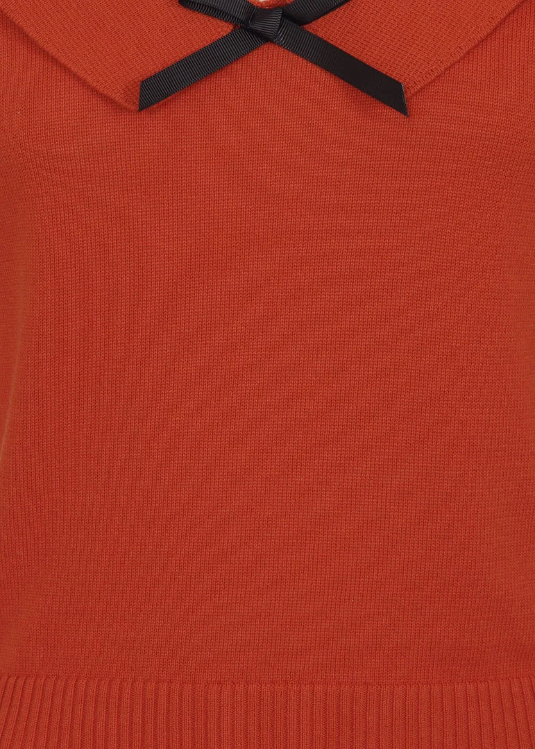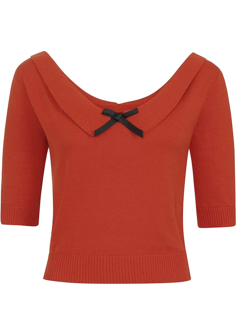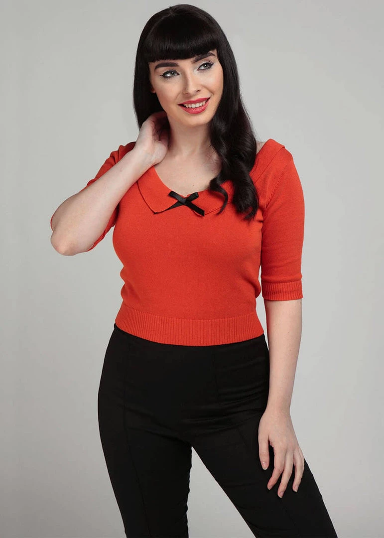 How adorable she is with her wide neckline, Peter Pan collar and the satin bow! This cutie is made of 100% knitted cotton, which gives her slight stretch and feels fantastic. The bottom seam and the ends of the half long sleeves are ribbed for a nice fit and keep the warmth inside. She ends in the waist, so you can easily wear her over a high-waist skirt or trousers.