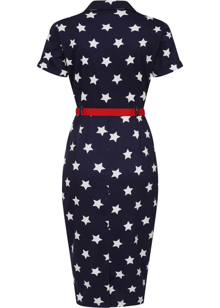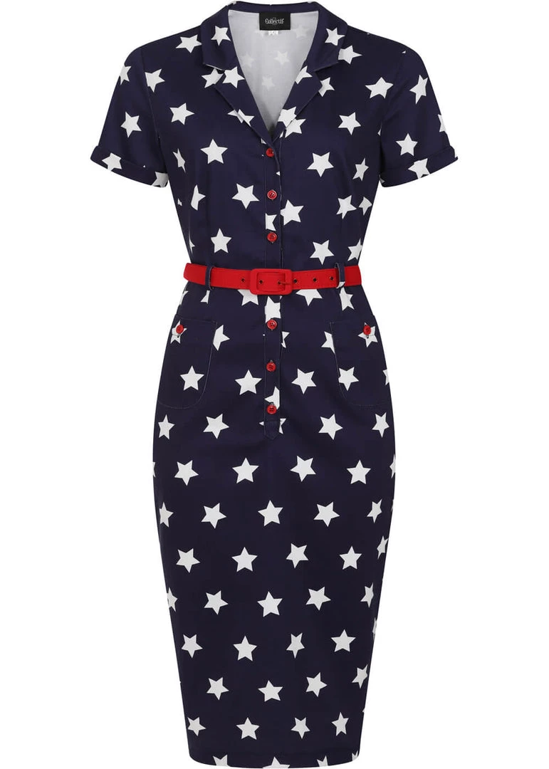 Caterina is lovely lightweight with her navy coloured cotton-mix with slight stretch, that is covered in playful stars.The waist is accentuated by the belt, for that Vavavoom 50’s line. She closes with the buttons for a timeless shirt-look, down from which she continues as a close-fitting pencil skirt down to the knee with a height of 1,70m. She even has little pockets!