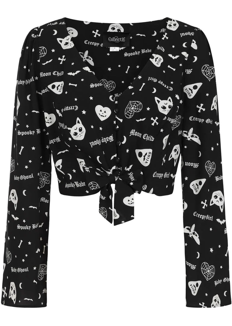 Holly is creepy and stylish, with her wider sleeves and the playful tie blouse model that closes with coated buttons! This occult gem is made of a gorgeous lightweight viscose without stretch, that mystically dances along when you move. You keep discovering in the print: bones, mots, cats and ouija-plectrums…