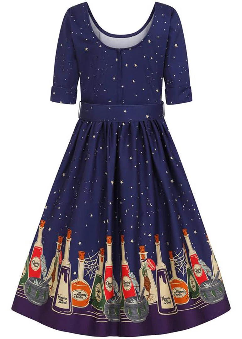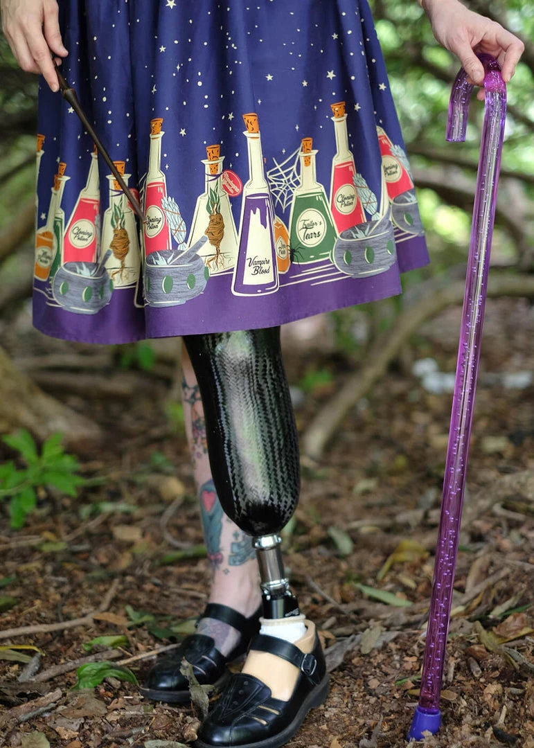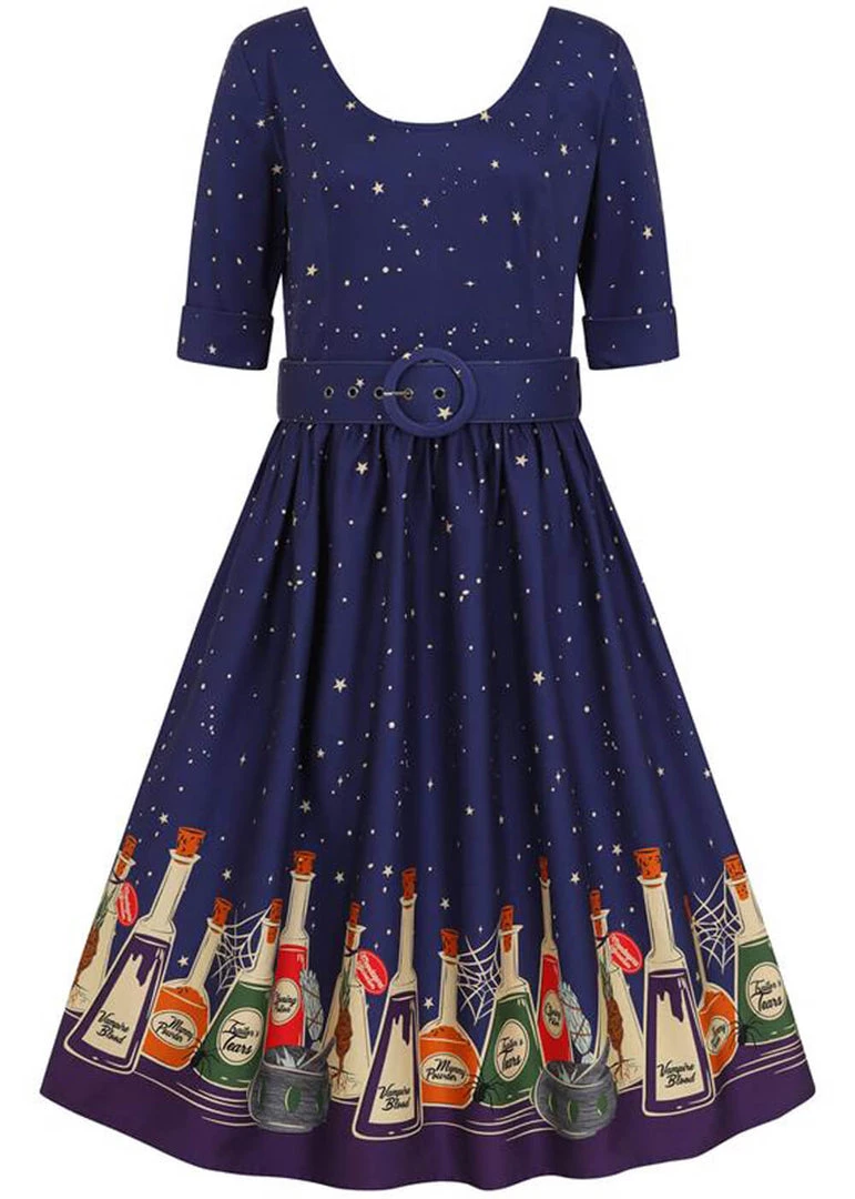 This beauty consists of a somewhat delicate quality cotton with a slight stretch, so you can enjoy your potions all day long. The wasit is accentuated by the detachable belt, down from which she continues into a full skirt. Which is perfect for combining with one of our petticoats to make those bottles dance. With a height of 1,70 she reaches down below the knee and closes with a zipper on the back.