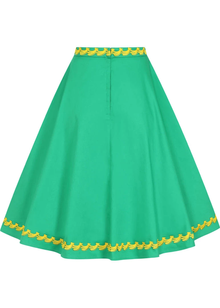 This beauty flares out from the non-stretchy waistband into a full skirt, which you can combine with one of our petticoats. With a height of 1,70 she reaches down over the knee and closes with a zipper on the back.