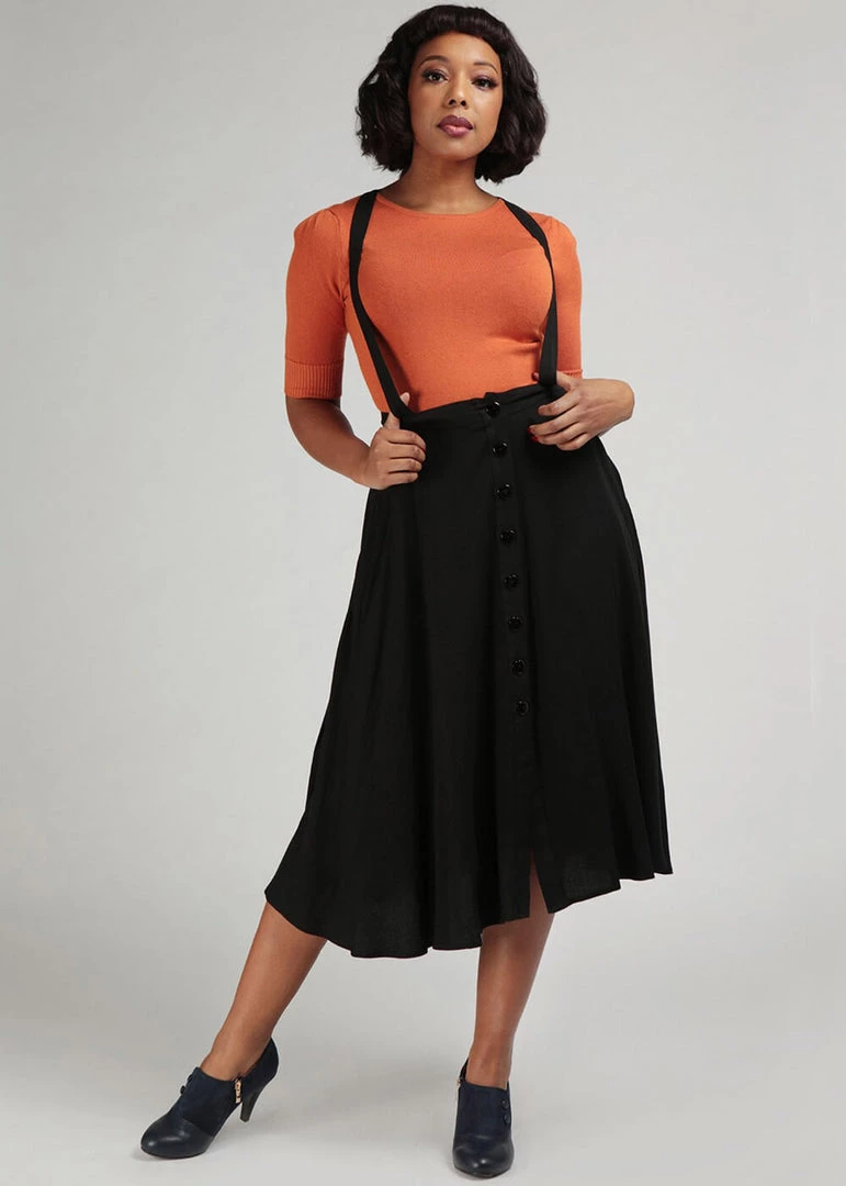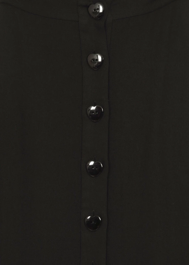Morgan is made of lovely lightweight viscose without stretch, that happily dances along with your every move. And you can’t not dance with these cute heart-shaped buttons she closes with! The shoulder straps are detachable, for even more options… From the waist, she flares into an elegant skirt that ends about halfway down the calves for a height of 1,70m.