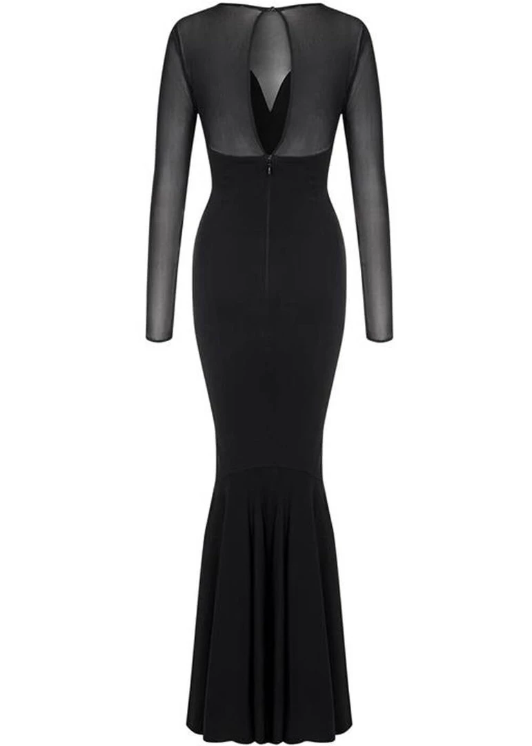 Even Mrs. Adams can’t be without killer-curves, which are inevitable with the stretchy but strong mix of cotton and nylon! The low neckline stays classy because of the semi-transparent mesh, that transforms into long sleeves and has a seductive peekaboo in the back, which closes with a button.