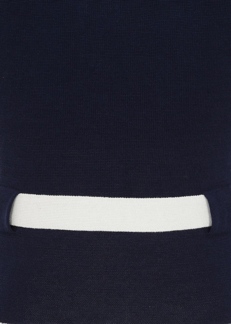 Whether you go for a 40’s nautical look or 60’s mod-outfit, Norma brings it to a higher level with her wide neckline with a playful collar. The waist is accentuated by the belt, before she slightly flares into a playful peplum. The navy-coloured knitted cotton has slight stretch and is lightweight to wear, when you’re going for a stroll as well as when you go dancing 😉