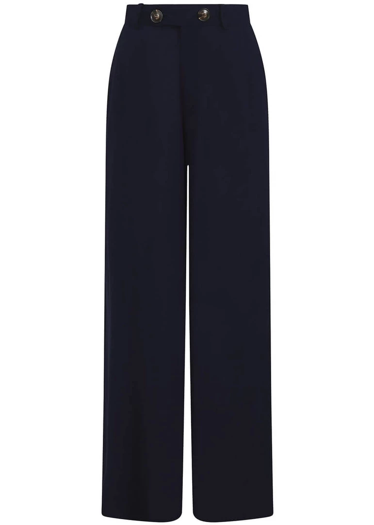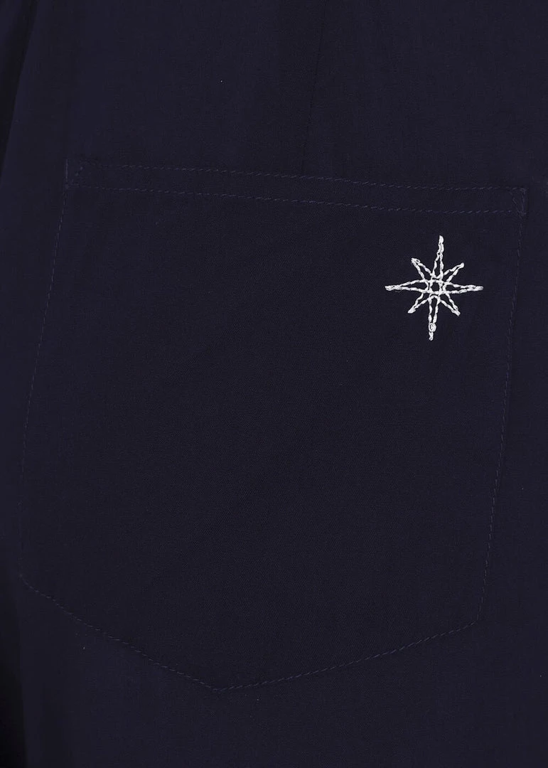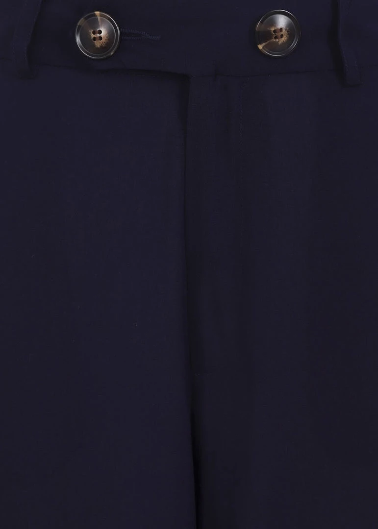 Style from the front, style from the back: Stella has it all! The waistband is adorned with two faux-tortoiseshell buttons, from where she flares into wide legs… Her navycoloured viscose without stretch is so lightweight, it’ll move along with your steps. Besides front pockets, she also has pockets in the back, the left of which is decorated with a star-embroidery! She closes with a zipper in the back and the two stunning faux-tortoiseshell buttons.