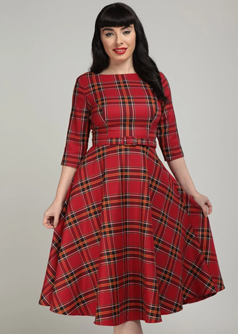 The waist is accentuated by the loose belt, downwards from which she flares out into a full skirt with pockets. She looks gorgeous when combined with one of our petticoats to really show off those stunning stripes! With a height of 1,70 she reaches just on the knee and closes with a zipper on the back.