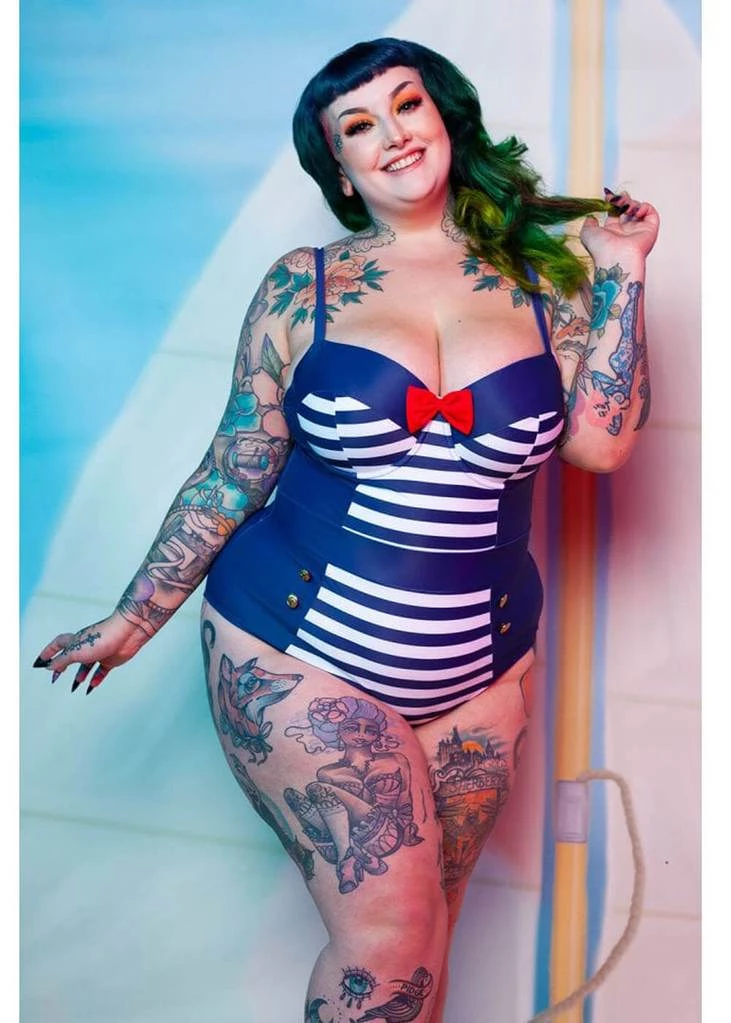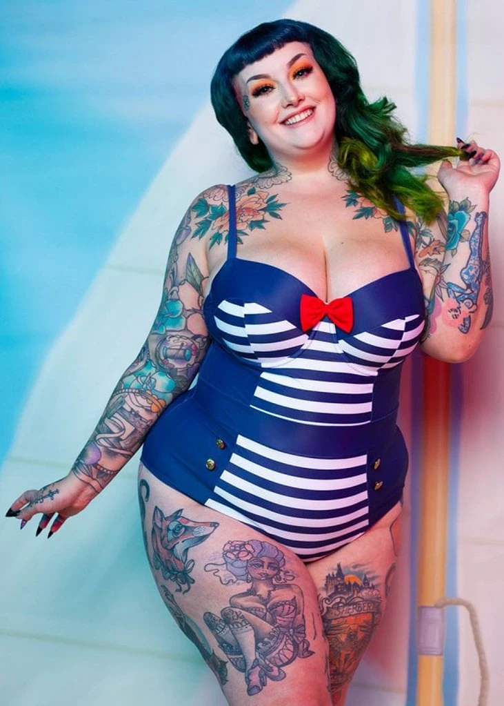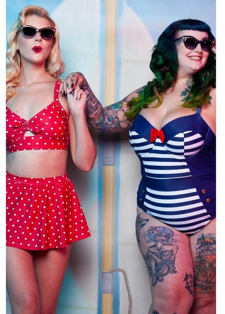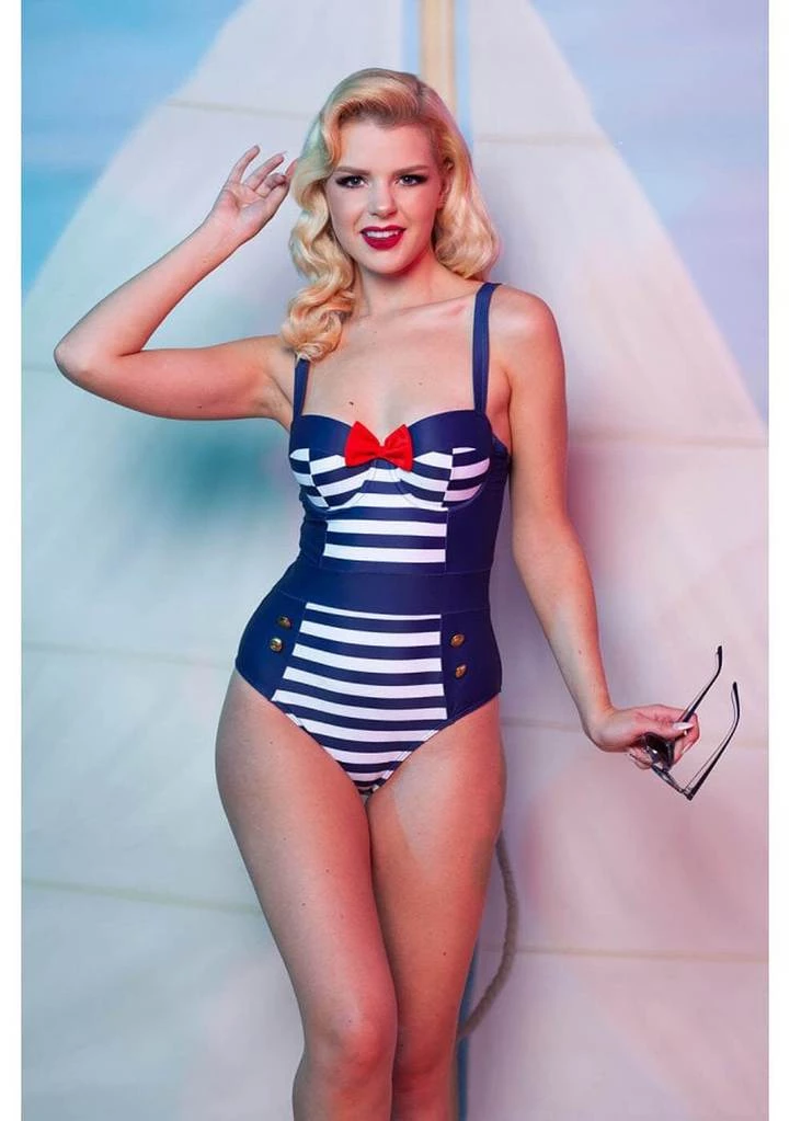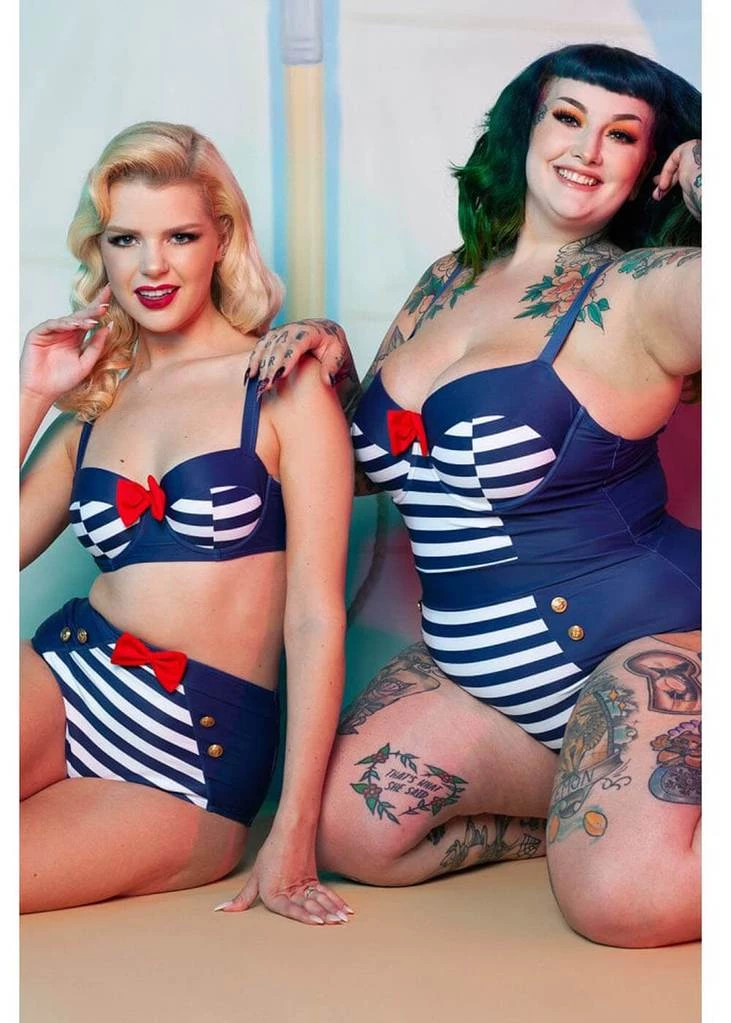 Ship ahoy, the ultimate sailor swimsuit! These vintage inspired swimsuits are super comfortable because of their lovely stretch. The straps are adjustable, the cups have a wire and pads. Size wise these swimsuits fit true to size, if you’re in between 2 sizes we suggest choosing the bigger size, the stretch is measured into the sizing chart.