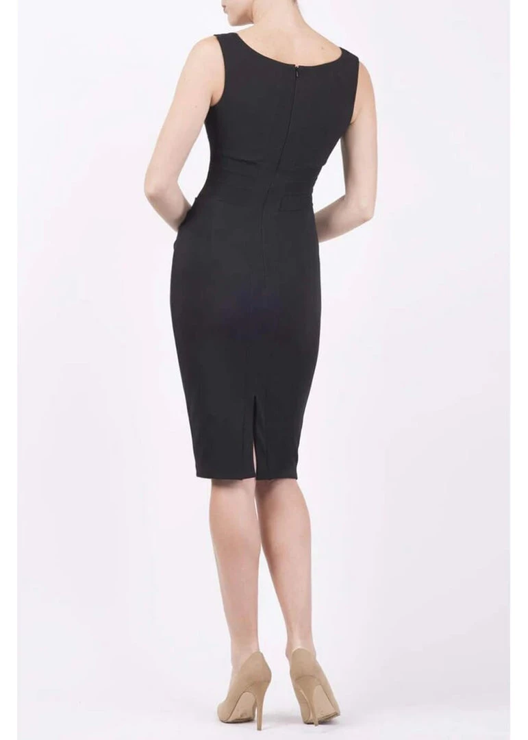 The pleats over the front are masking a little belly and make for a flattering fit, as do the figure seams. She closes with a zipper in the back, where she also has a split to make walking more convenient. Diva Catwalk is made in the UK.