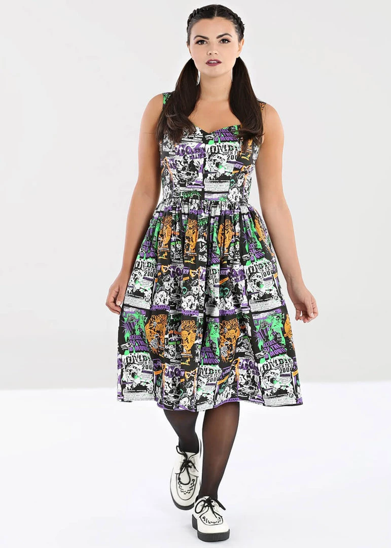 Small folds flare from the waist seam into a full skirt with pockets, that you can wonderfully wear with one of our petticoats to make the movies come to life. She’s made of a high quality cotton-mix with slight stretch, closes with a zipper in the back, and for a height of 1,70 m she ends around or just below the knees.
