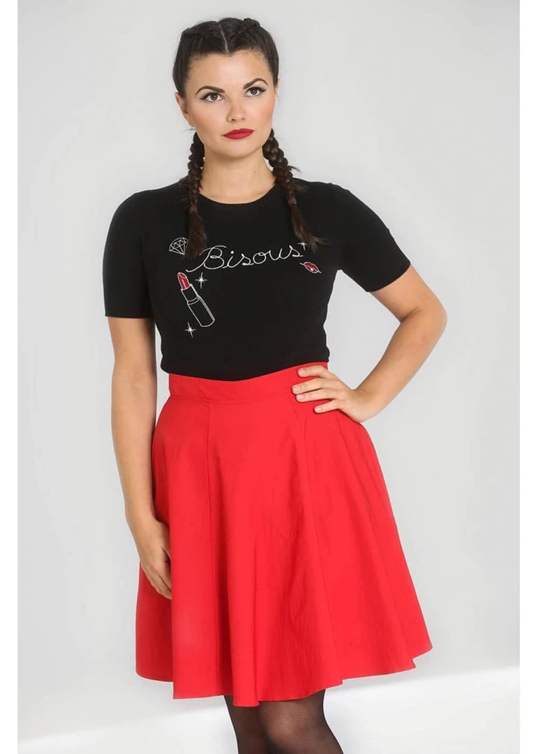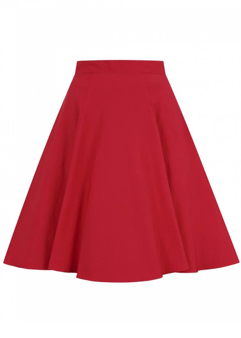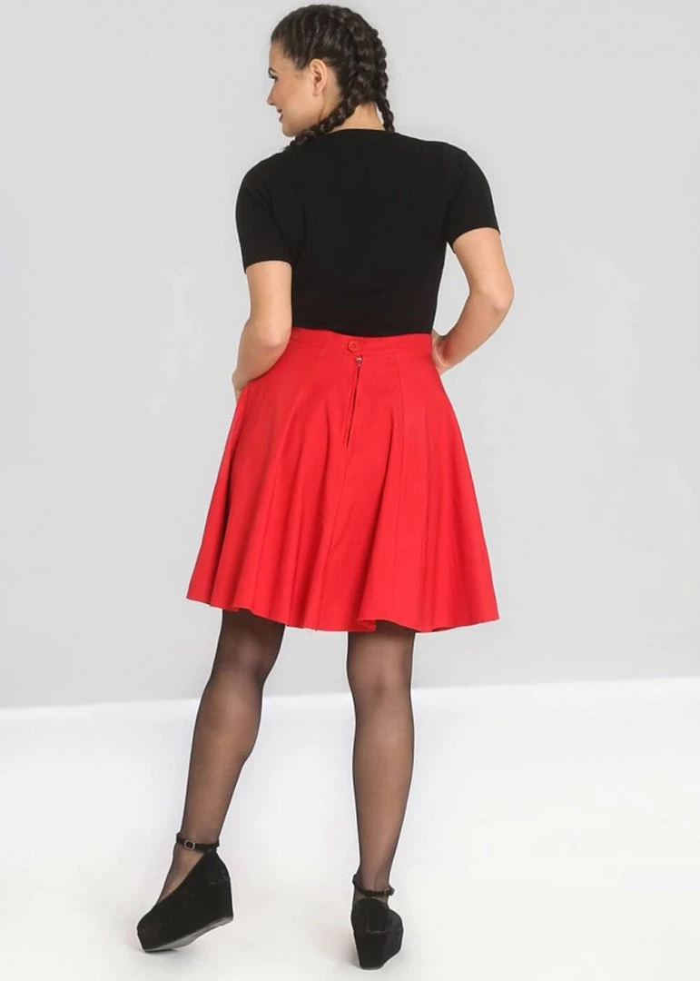 For a height of 1.70, she ends above the knees and is therefore a bit shorter than most other Hell Bunny skirts. Nice and playful for any occasion! She’s worn in the waist, from where she flares into a playful skirt. Gabby is made of a stretchy viscose/nylon mix that feels like bengalineand closes witha zippe rin the back.