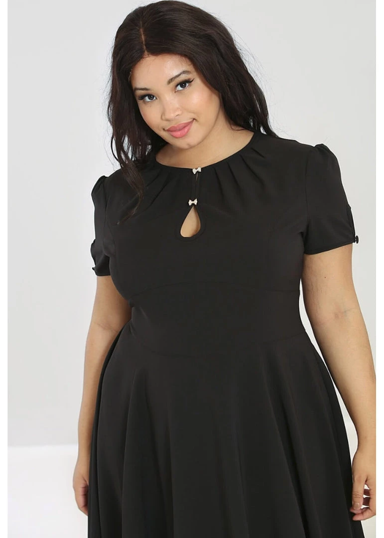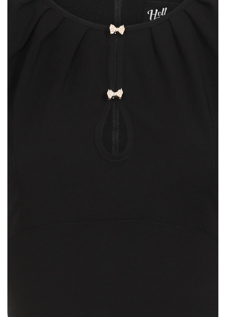 What a beauty she is with her short cap sleeves with keyholes, a detail that returns at the chest, and yes: bow-buttons! She has an elegant fit thanks to the playful gatherings around the neck and the seams at the chest.