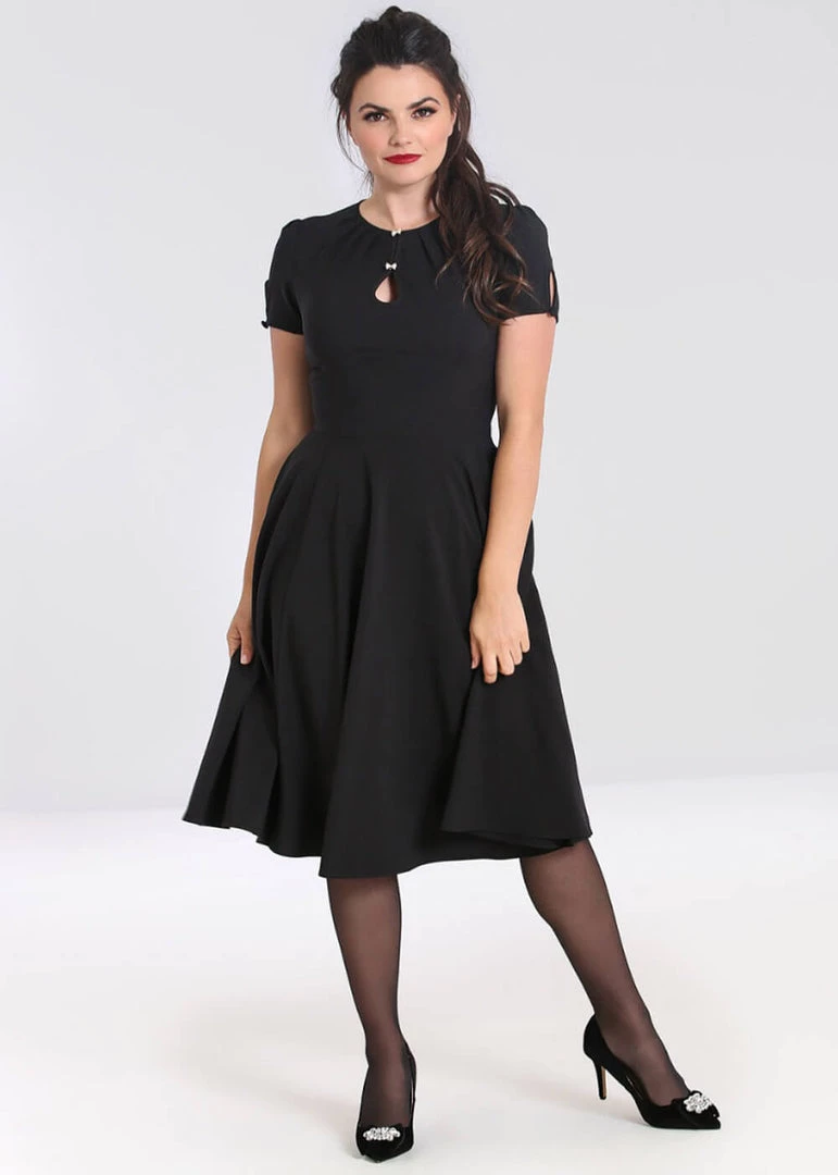 From the waistband, she flares into a lovely full skirt that you can perfectly wear with one of our petticoats for the ultimate vintage-look. She closes with a zipper and hook in the back and for a height of 1,70 m she ends below the knees.
