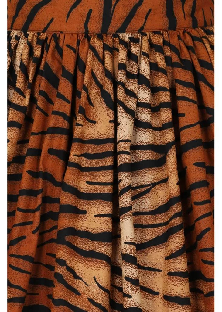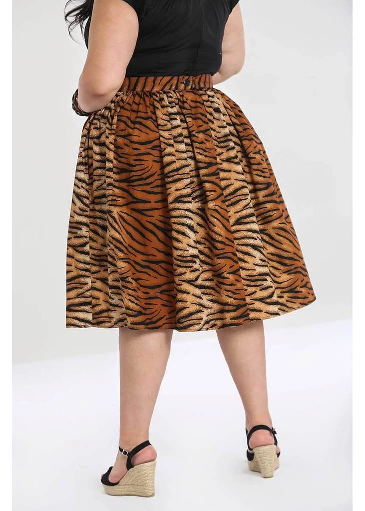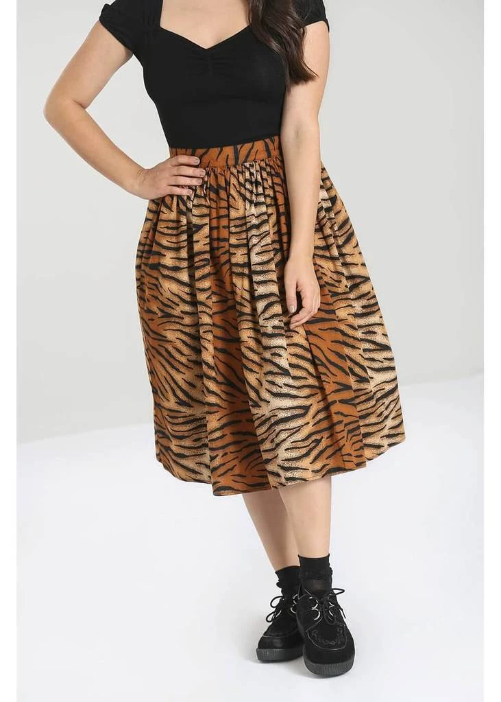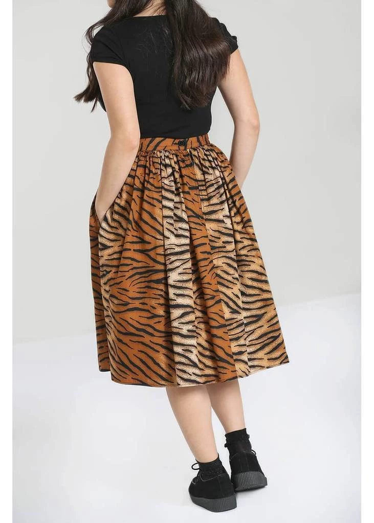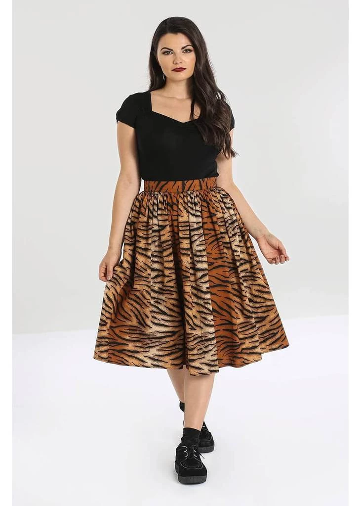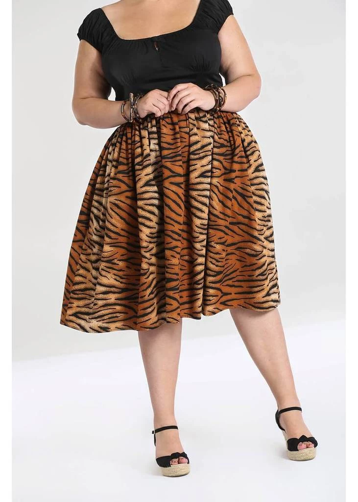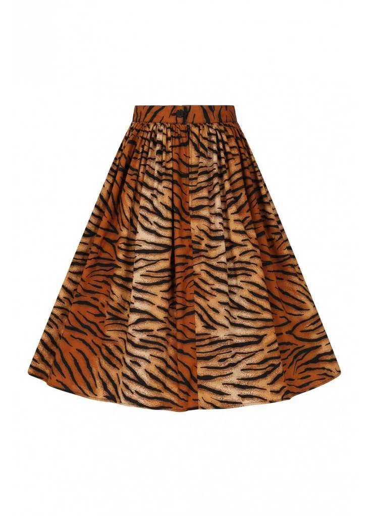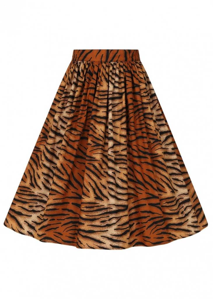 Rockabilly, tiki or a little tacky, a good tiger print is always welcome! From the waistband down she flares out through pleats into a full skirt with pockets, and is perfect for wearing with one of our petticoats to make those stripes roar. With a height of 1,70 she reaches down over the knee and closes with a zipper and button on the back.