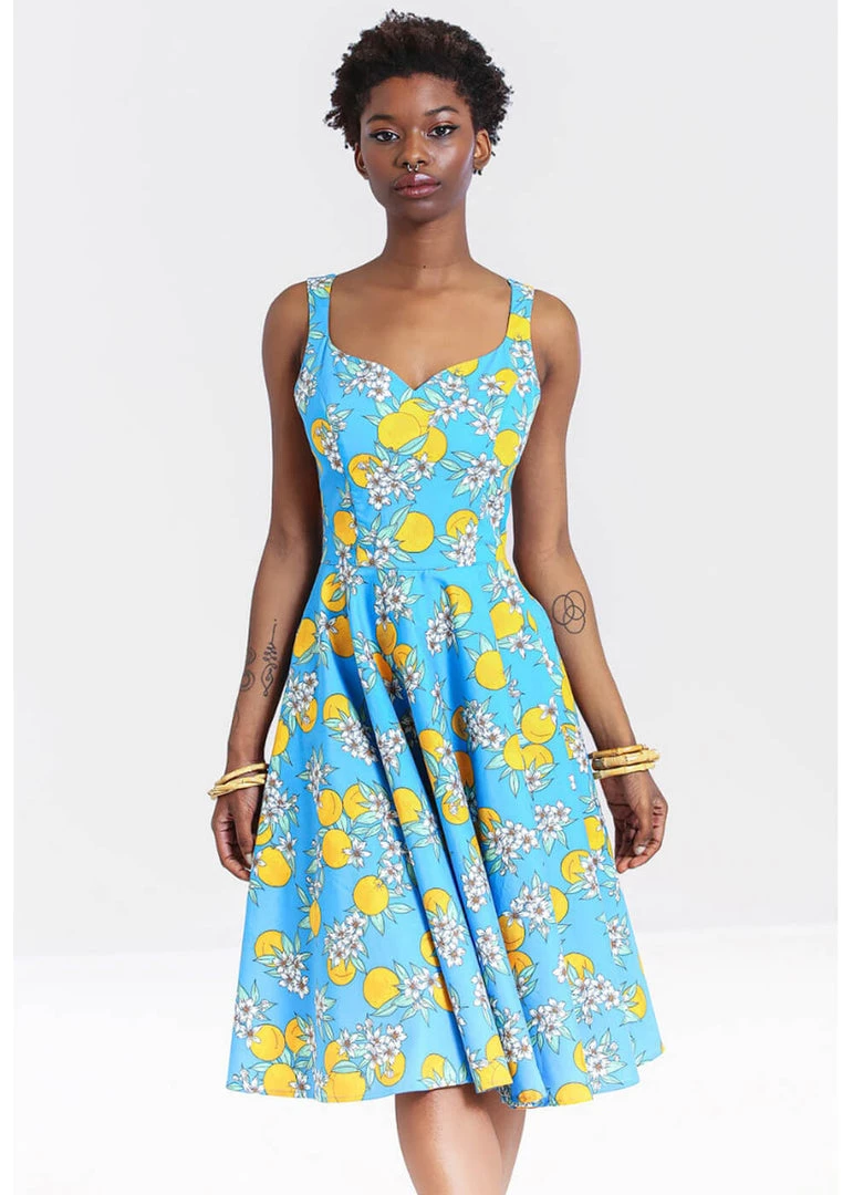 You can’t help but imagine you’re in tropical places because of the breathtaking oranges… This exotic cutie is made of an airy cotton-mix with a slight stretch which feels just as nice to wear as she looks. The bodice has a beautiful fit because of the seams. From just above the waist she flares out into a full skirt with pockets which you can gorgeously combine with one of our petticoats to make Kalani come to life.