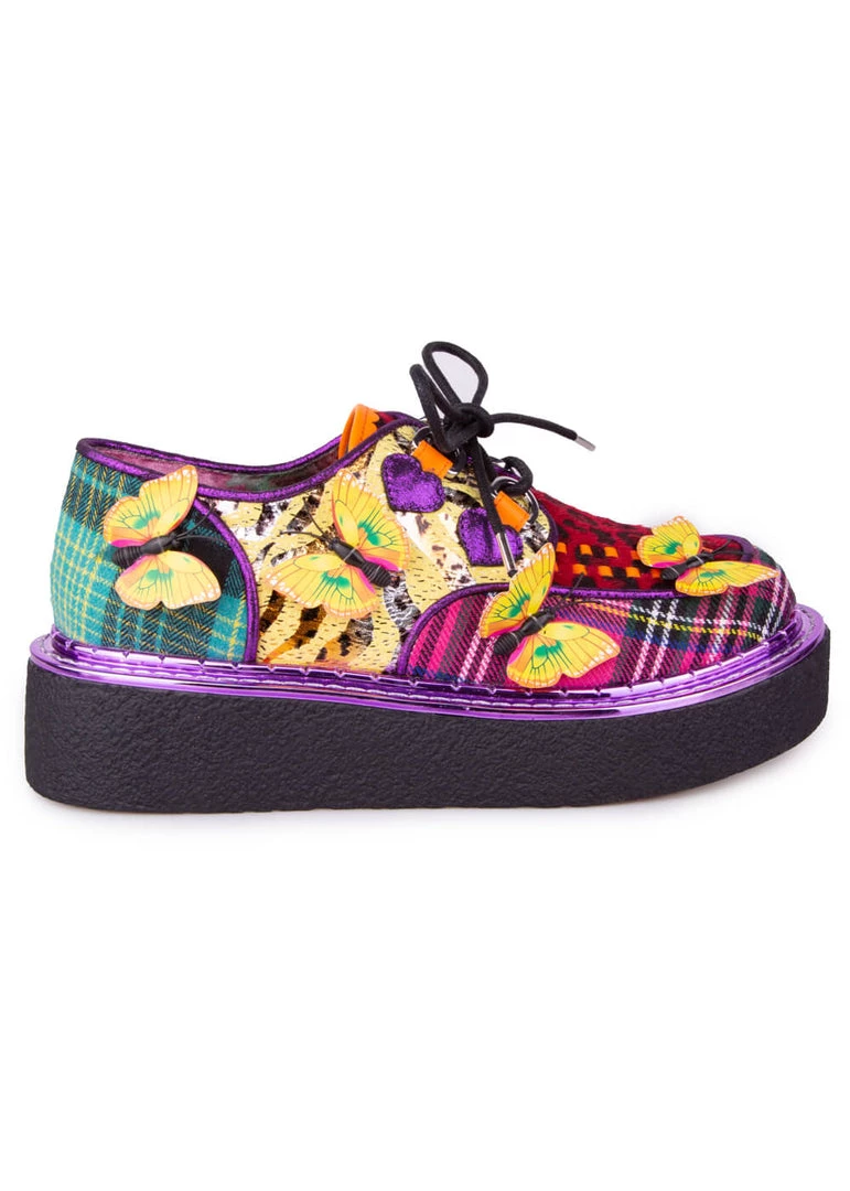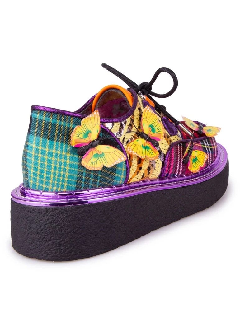 There is so much going on, you don’t know what you’re seeing! Stunning 3-D butterflies are crawling over the whole scenery: happy green and pink tartan on the heel and the nose, exciting animal prints on both sides and soft leopard spots on the top. Teh purple and orange details are the finishing touch, wow!