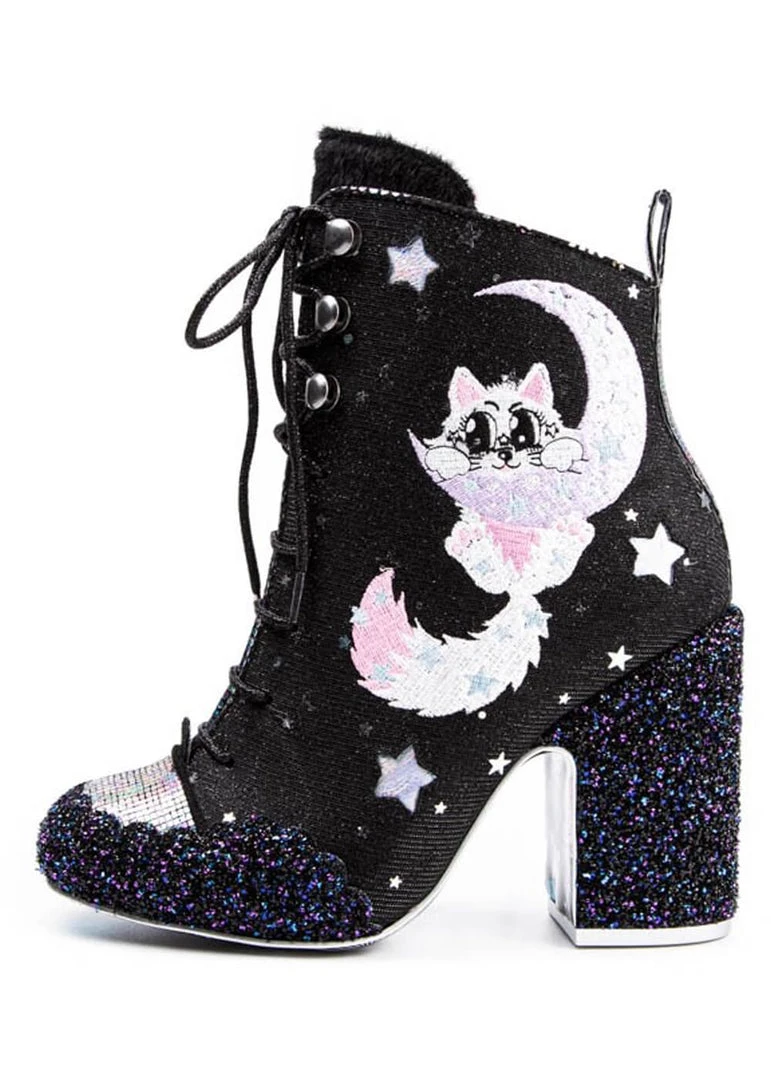 They’re both embroidered and totally at home in space, which is represented by a special fabric with happy glitters and stars. The flap has a bonus, it’s covered in hearts! The heel (which is incredibly comfortable to walk on despite her 9 cm), as well as the bottom are covered in dark purple and black glitters. They close with a zipper on the inside.
