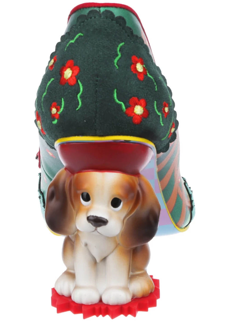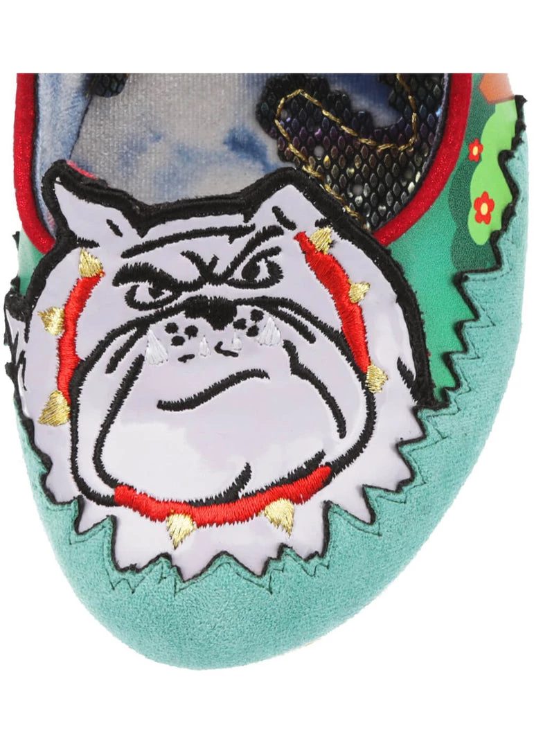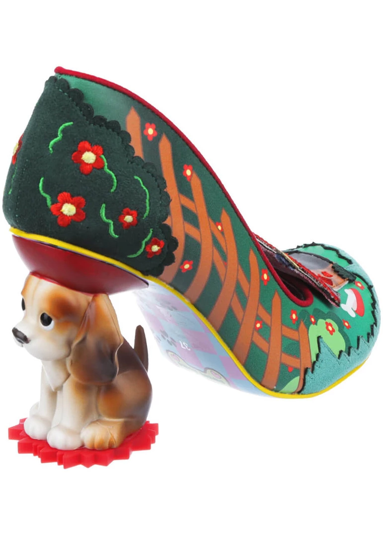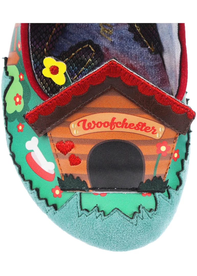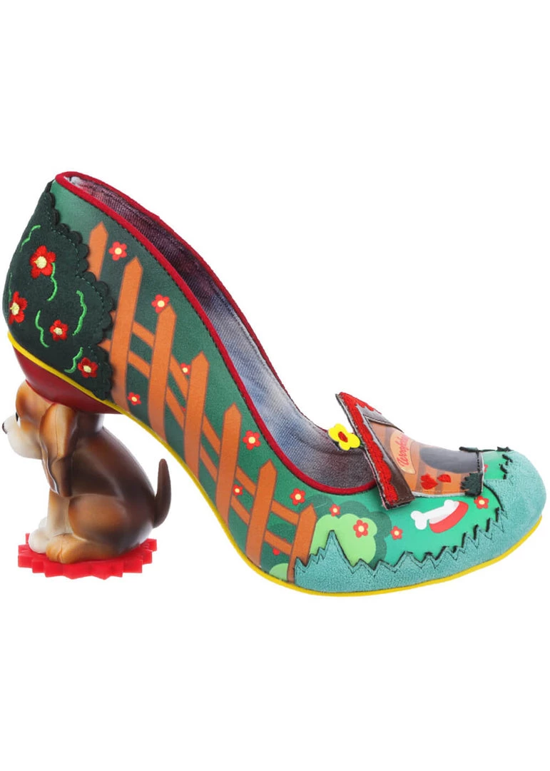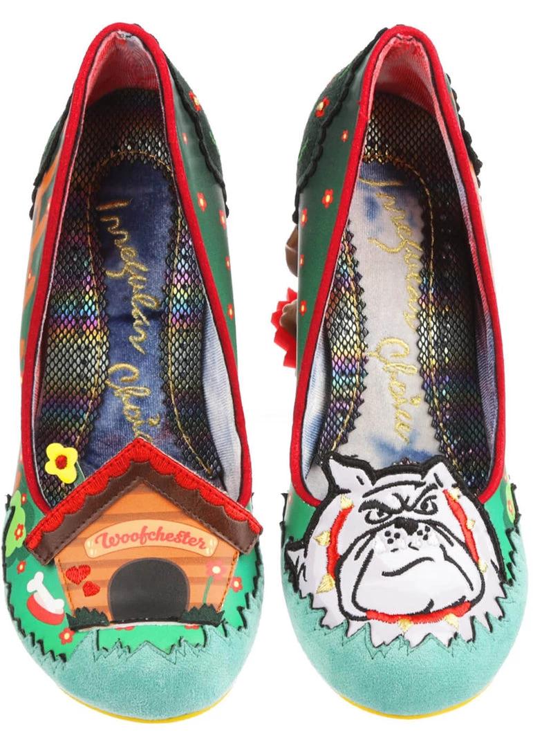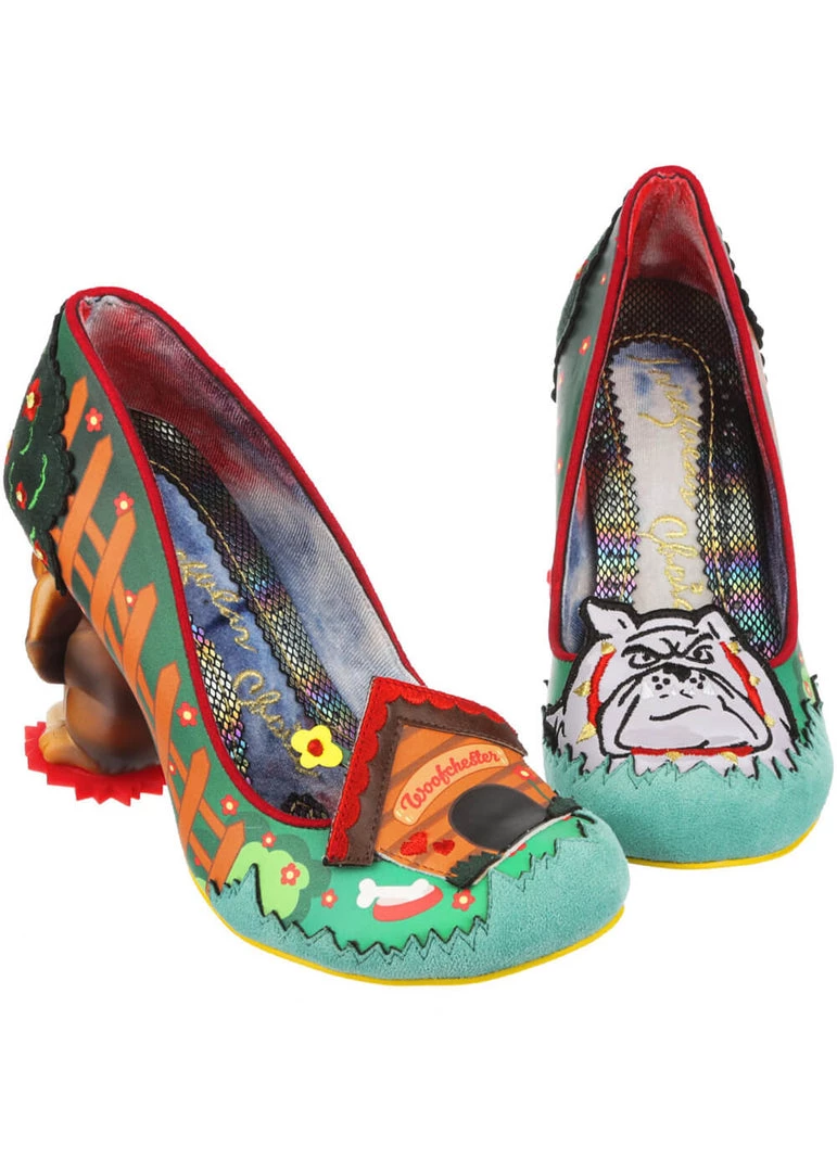 The shoe itself is a spectacle, too, it’s like a garden! The fence on the side keeps the dog hut and the tough bulldog where they belong.