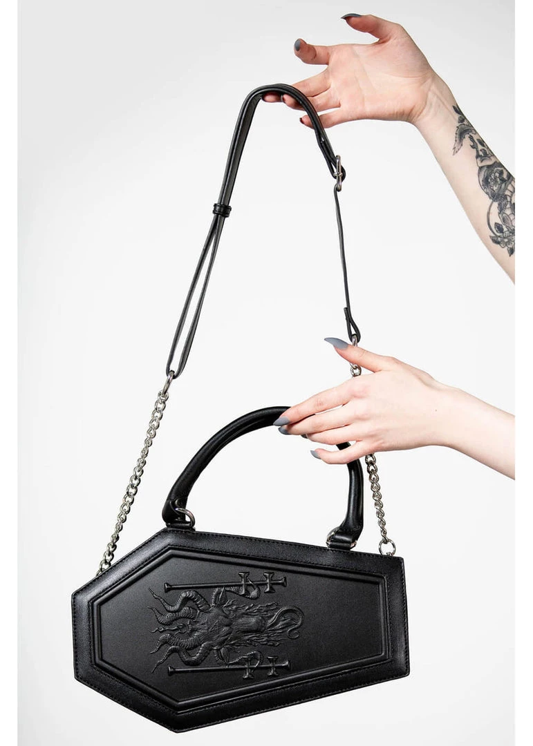 This gem has a stunning devil-relief on a handbag of high quality vegan leather, that keeps its shape nicely. It’s spacious enough for a your phone and your essentials and on the inside she a innerpocket with zipper.