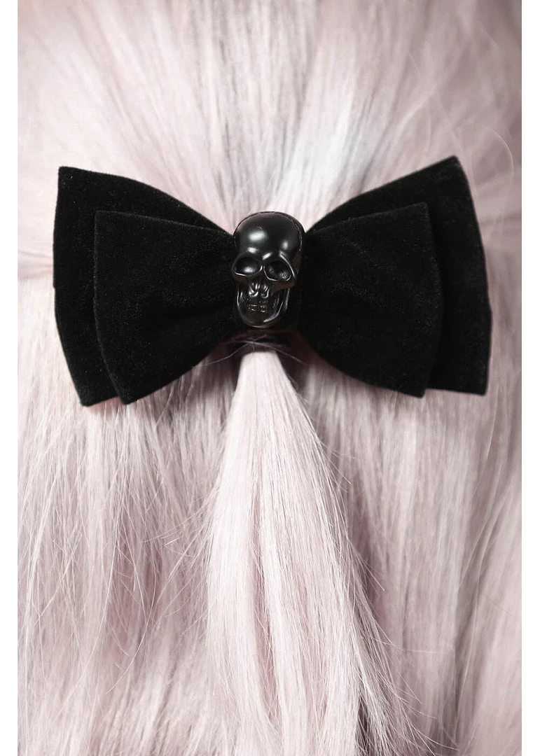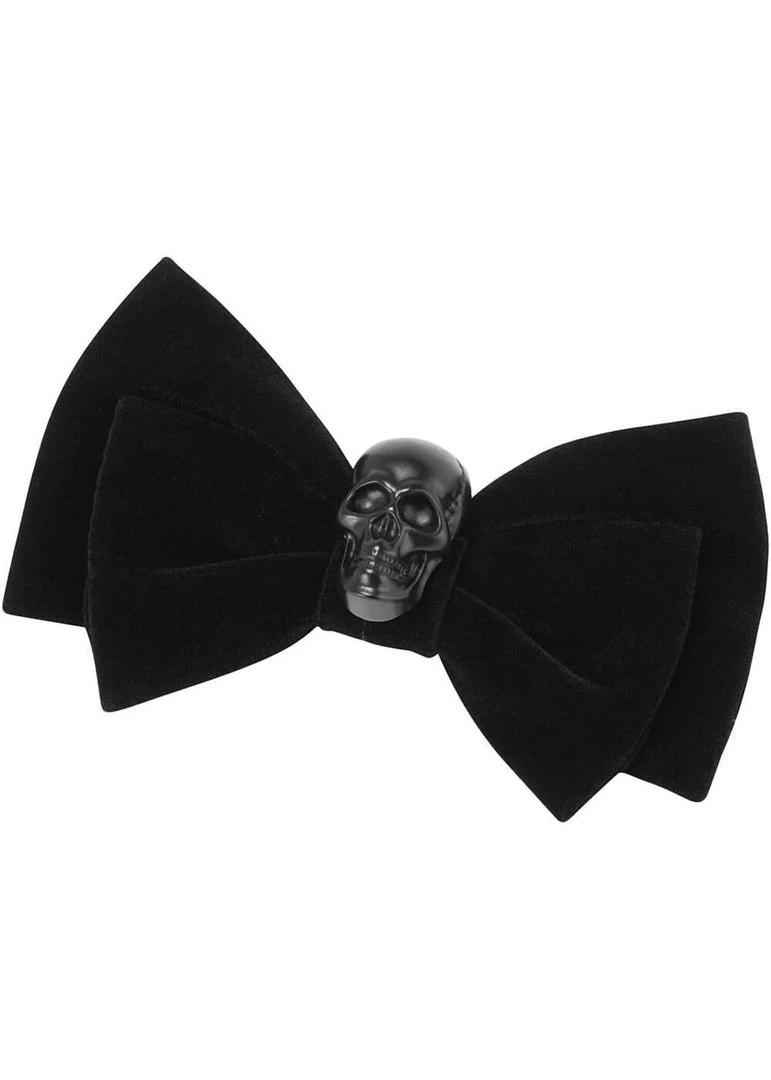 With her width of almost 10 cm, this strong velvet bow is anything but subtle, our favourite! The black skull in the middle makes her the dark icing on your ghoulish look. The clip on the back is easy to fasten and keeps her in place all day long.
