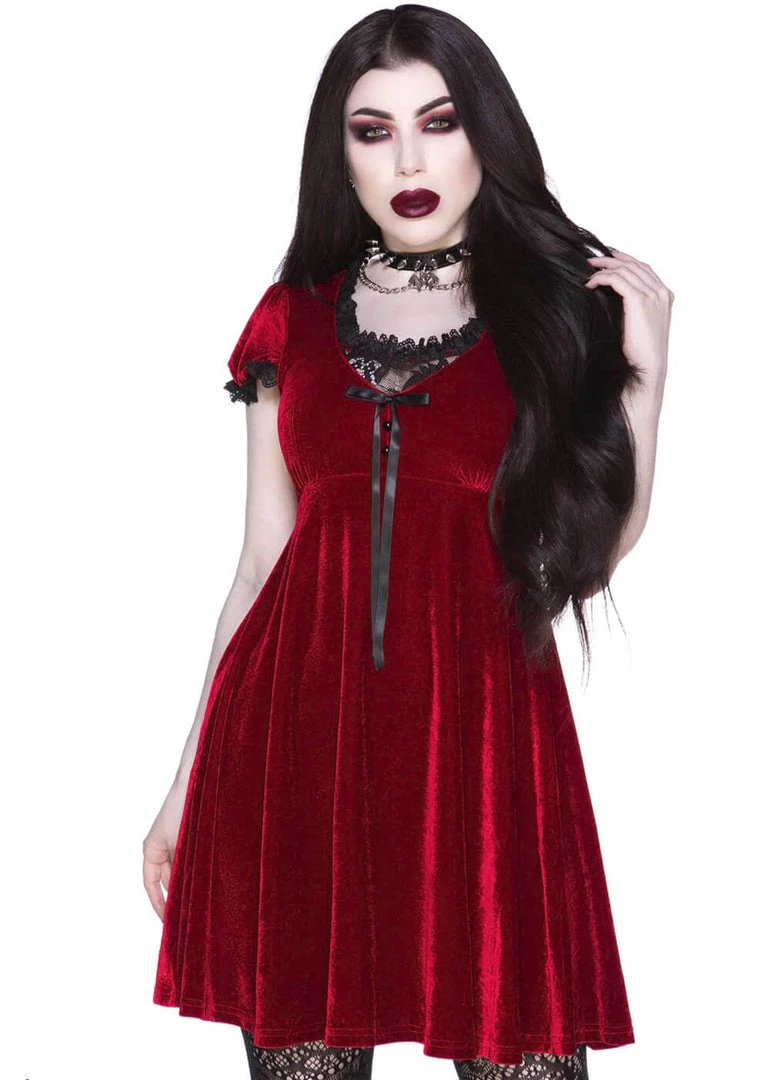 The enticing neckline is adorned with a little bow and lace edges, just like the short puffy sleeves! The petable soft velvet has fine stretch, so you can simply slip her on and you’ll never want to take her off again 😉