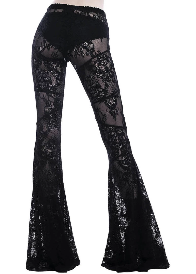 Literally, because this beauty has no lining and is entirely made of lace with a slight stretch. Making her perfect for showing off your most beautiful stockings, leggings or trousers! The Sarita trousers are richly decorated with so much lace a boudoir would get jealous. The waistband is elastic and the bottom flares out, making her look stunning with a witchy 60s or 70s look. Because of her length she’s perfect for wearing with high heels or platforms.
