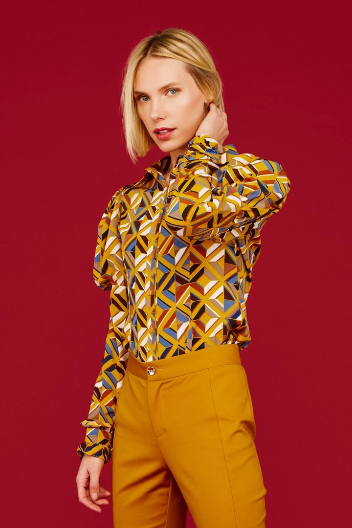 Get hypnotized by Greta’s geo lines, that even run across the collar! She’s made of a smooth fabric without stretch and closes with smooth buttons in the front and at the ends of the sleeves, that are adorned with 2 gathered seams. The shoulders are spectacular with the puffy top thanks to the pleats, before she continues as a close fit.