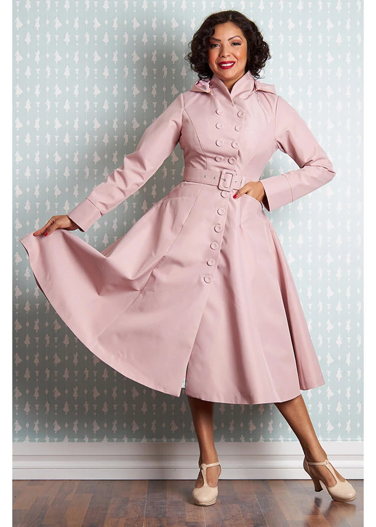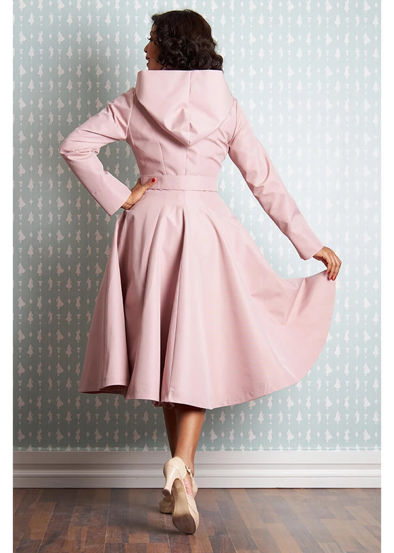 You’ll keep spinning around in this trenchcoat, since the pleats on her sides and the back give her a lovely full skirt. Perfect to keep all your petticoat dresses dry 😉 The big collar, that flares into a hood that is removable with a zipper, and the wavy row of buttons make for a look to turn heads with, so fancy, so charming! The removable belt accentuates the waist for that special elegant trenchcoat 50’s look.