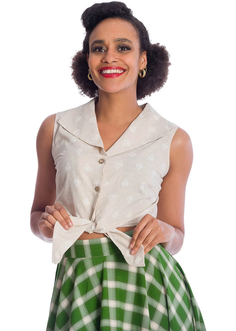 You’re up in the clouds with these hot air balloons on the fine cotton mix with slight stretch. This knotted blouse is a bit shorter and reaches down to the waist. Just as cute with cool jeans as with a high waist skirt! And did you notice the wooden buttons she closes with?