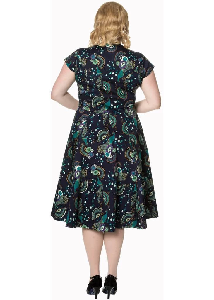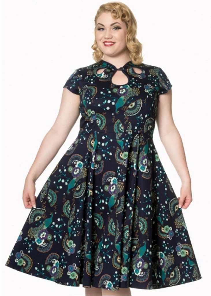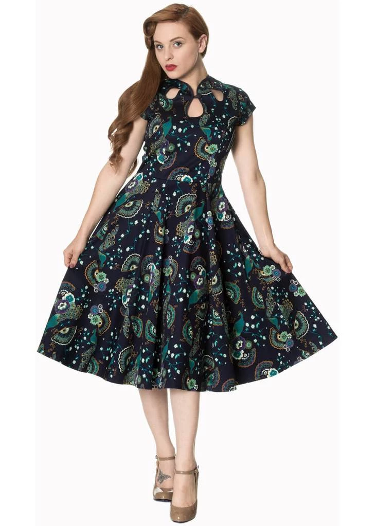 What a stunning dress, with her gorgeous peacock print…. Even the cut itself looks extraordinary with her cut outs on the bodice. From just above the waist this dress flares out into a full skirt, which is perfect for combining with one of our petticoats for that extra cheerful bonus. The dress closes with a zipper on the side and a button by the neck.