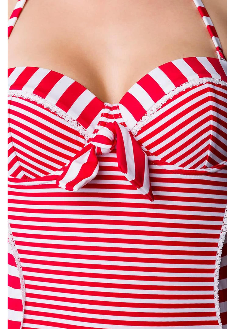 Sweet without being pink, that is our Candy Stripe bathing suit! This beauty has pre-shaped padded cups and straps to tie in the neck, that are adjustable and removable. The seams on the bodice and the cups are decorated with small white lace details. The elastic and the trouser legs keep everything nicely in place. Thanks to the stretch, she is a dream to wear, whether you’re stealing the spotlight in the water or relaxing on your towel!