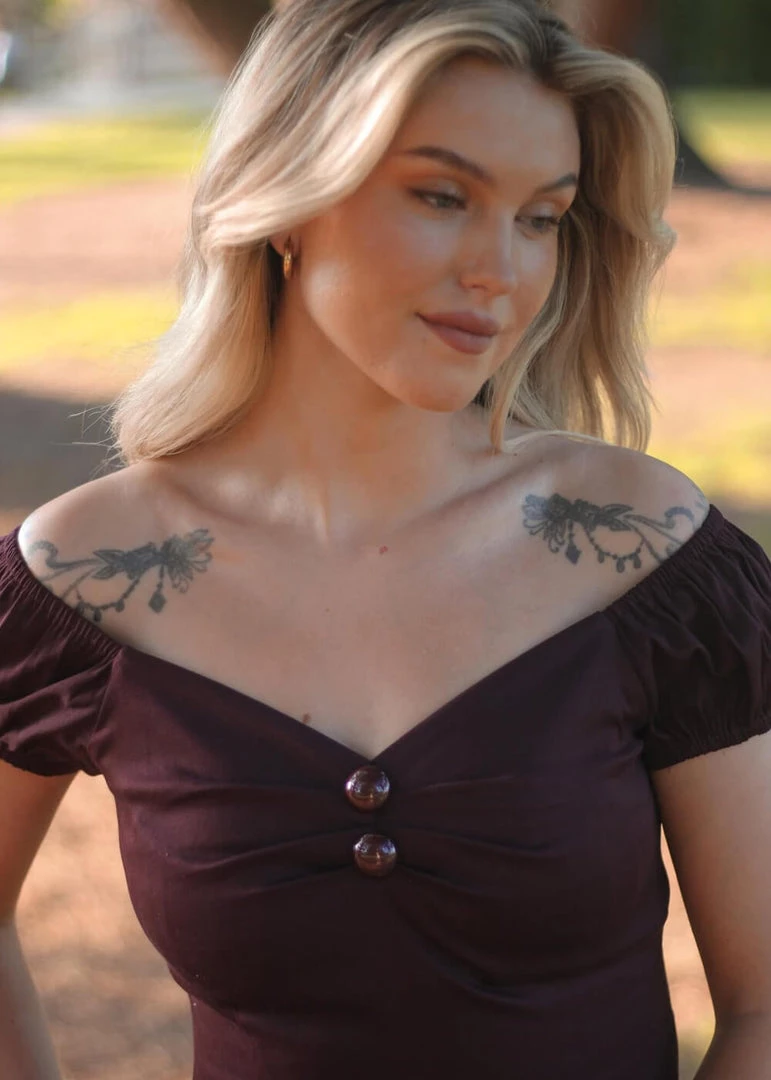 This model has a sexy pinup appearance because of her sweetheart neckline and the typical carmen style sleeves, that slightly puff up thanks to the elastic. Because of the slight stretch the top is nice and form fitting for an amazing VaVaVoom feeling, there’s a zipper on the side.