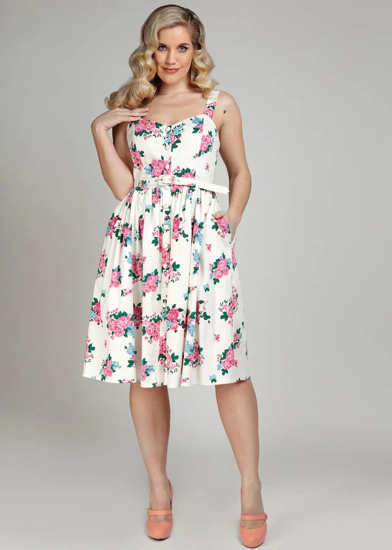 Scenic flowers cover her beautiful quality cotton-mix with a slight stretch and sateen finish. Her sweetheart neckline continues into the cute shoulder straps and and the seams ensure a stunning fit. The shimmering buttons across the entire front add an extraordinary look, and also serves as the closure.