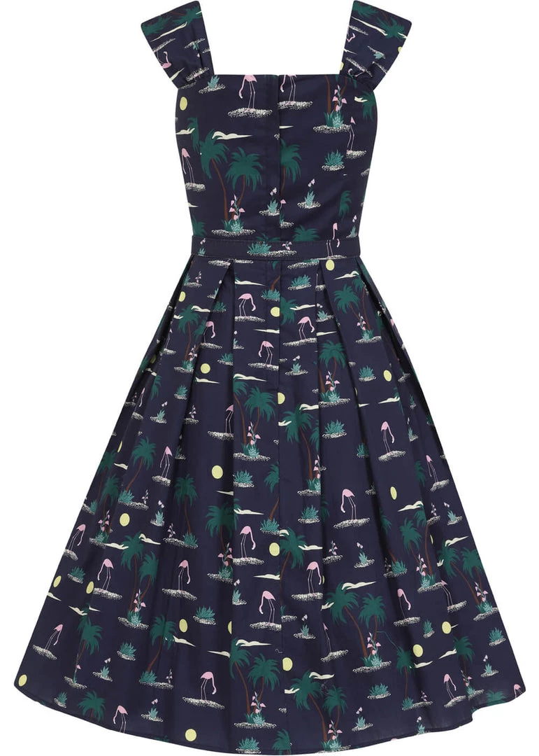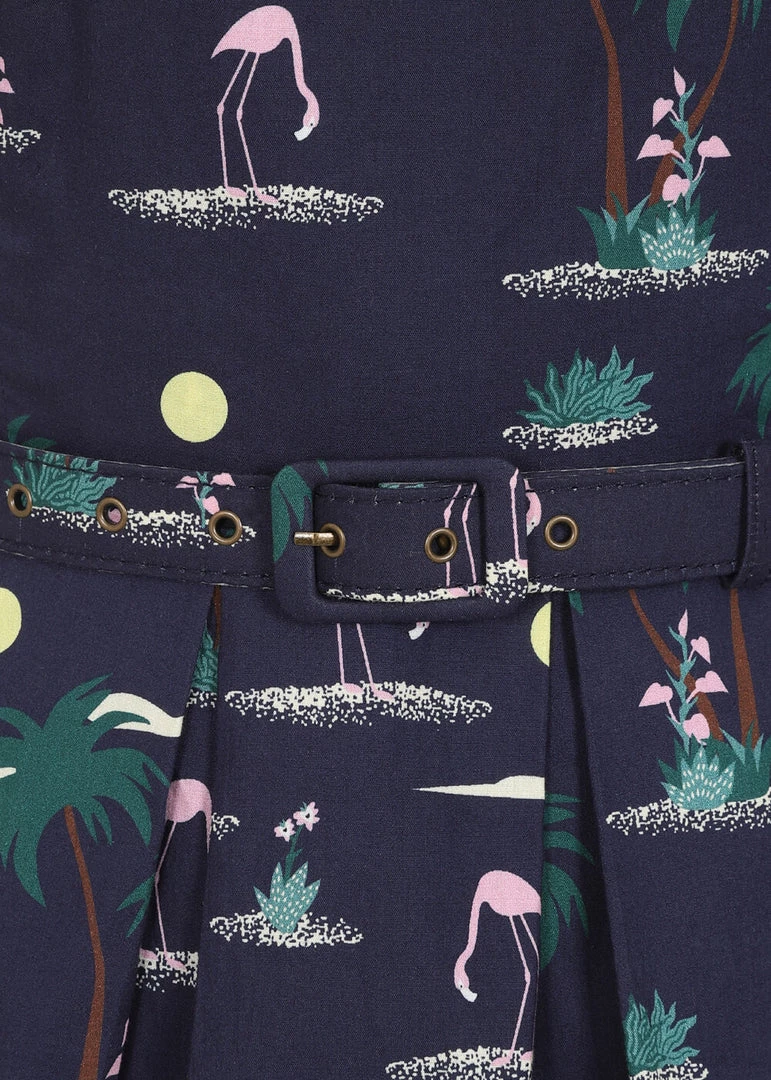 The waist is accentuated by the belt, down from which she flares out into a playful skirt. To make those birds shine you can combine her with one of our petticoats. With a height of 1,70 she reaches down to the knee and closes with a zipper on the back.
