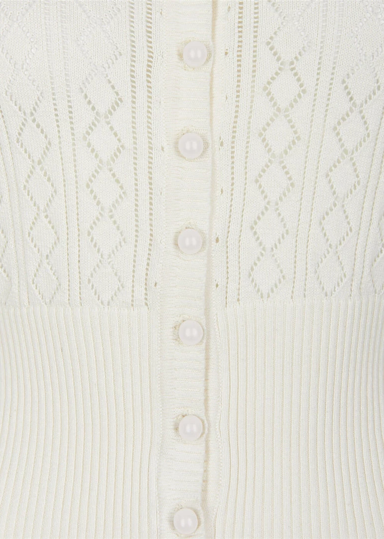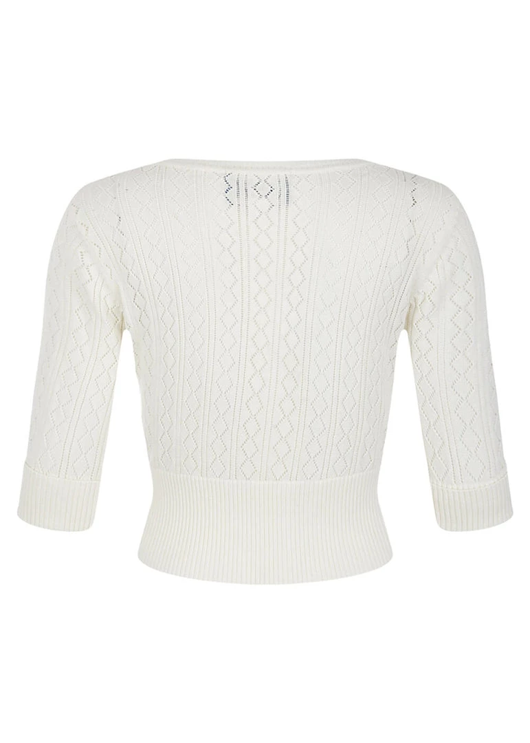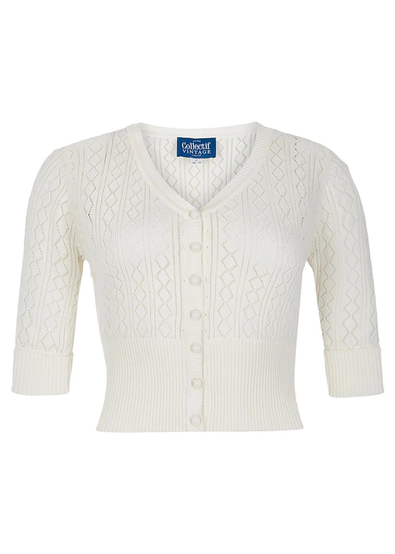 The gorgeous knitted cotton with the open pattern make her a dream to wear and a joy for vintage-loving eyes. She closes with the smooth buttons in the front. The short model is perfect to wear with all those beautiful dresses, but also eyecatching enough to be worn as the main act above a high waist skirt.