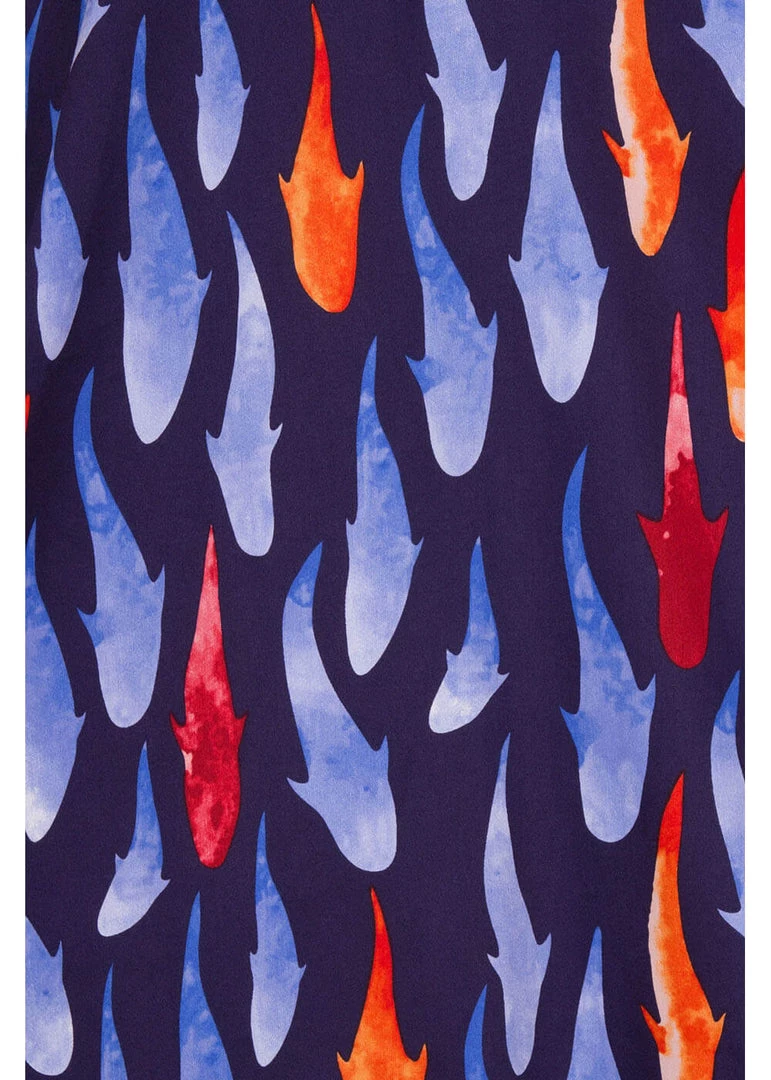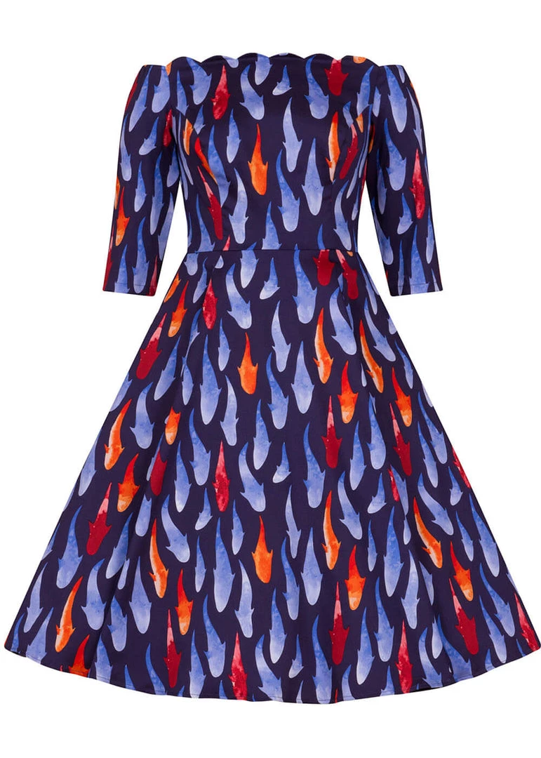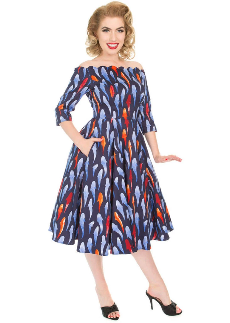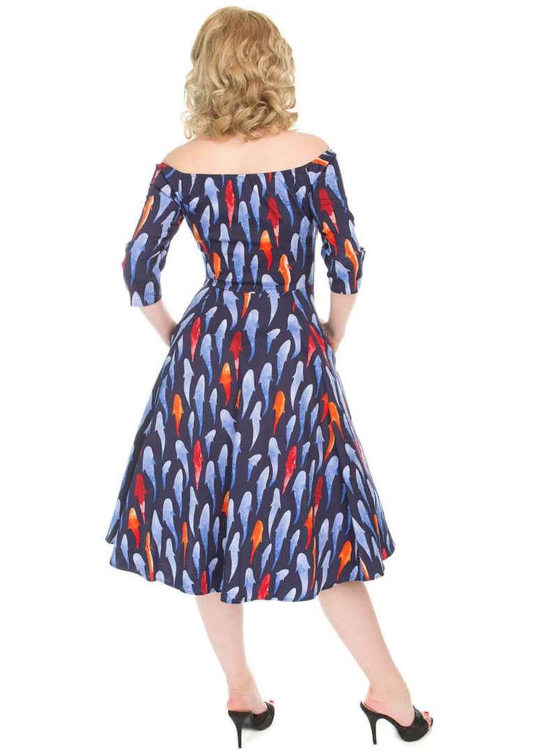 The fish-theme nicely continues in her scaly neckline, with a sudden relaxed, straight line along the back. With her gorgeous quality cotton-mix with a slight stretch she is so beautifully form fitting, it almost as if the fishes are swimming all over you!