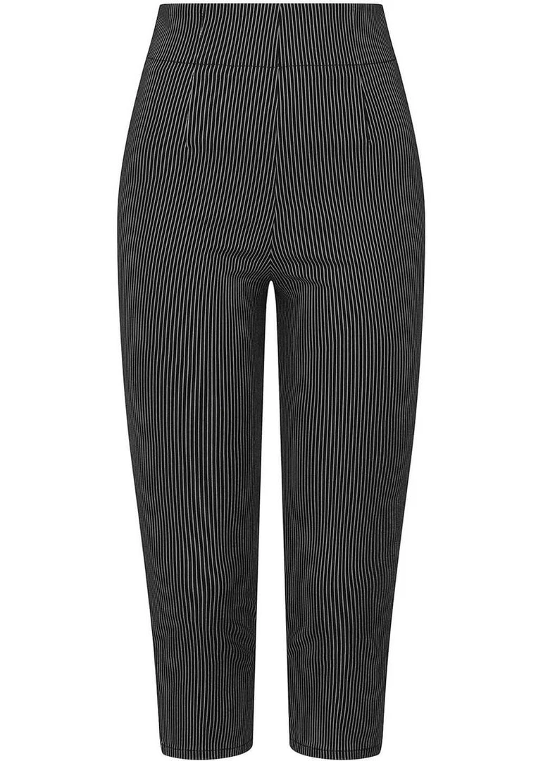 Because of the rayon/nylon mix she has amazing stretch without showing lines (expect the pinstripe ones 😉 ). The waistband and the figure seams ensure a beautiful fit. She closes with a zipper on the back, where the bottom of the trouser legs each have a slit, with a little faux-leather-bat!
