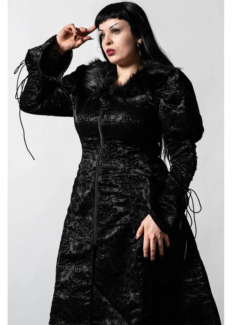 She has a VaVaVoom closefitting bodice with a neckline that is decorated with faux-fur, from where she flares into an elegant skirt with pockets that is a little longer in the back. Even the zipper is gorgeous with an elegant cross. This gem is lined and not padded.