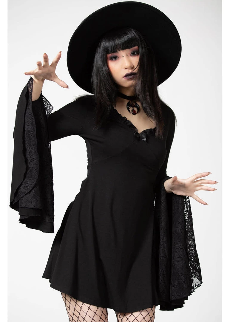You’ll talk with your hands a lot, just to show off these breathtaking sleeves with lace! Her sweetheart neckline is adorned with a bow. The bodice is nicely close-fitting and has seams running across or just underneath the chest, from where she flares playfully into a skirt that ends above the knees for a height of 1,70 m.