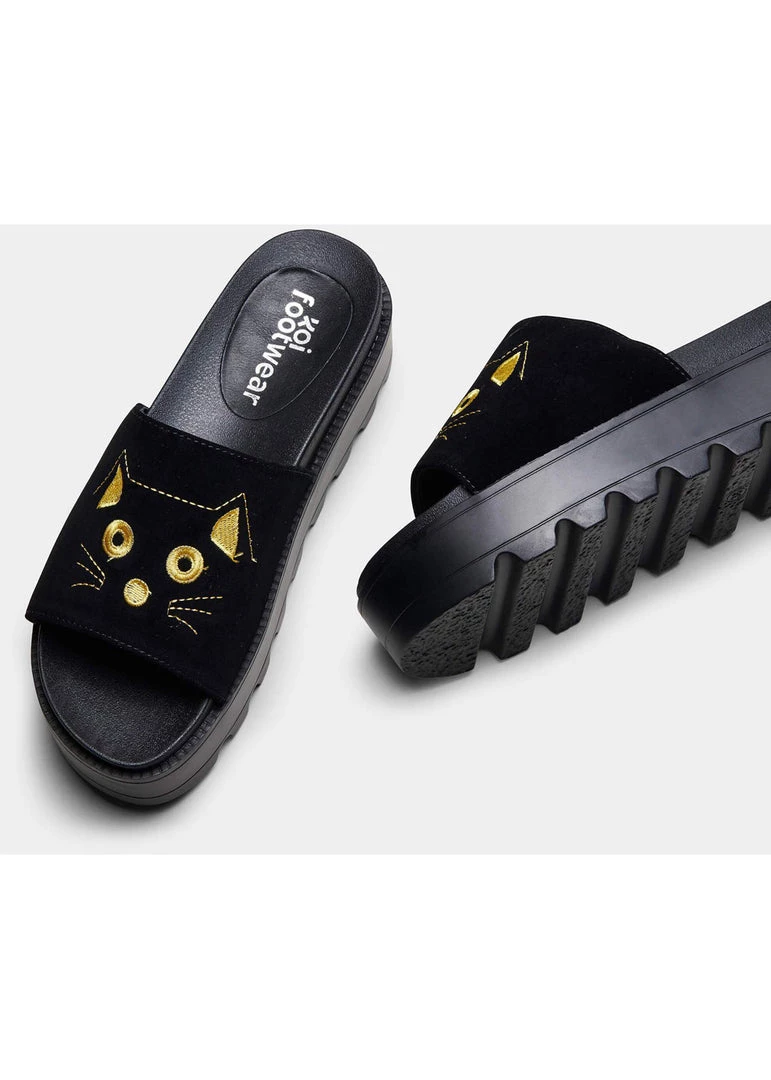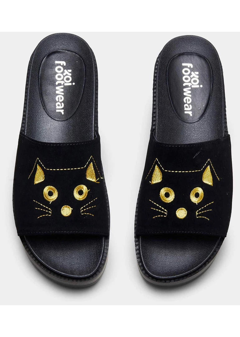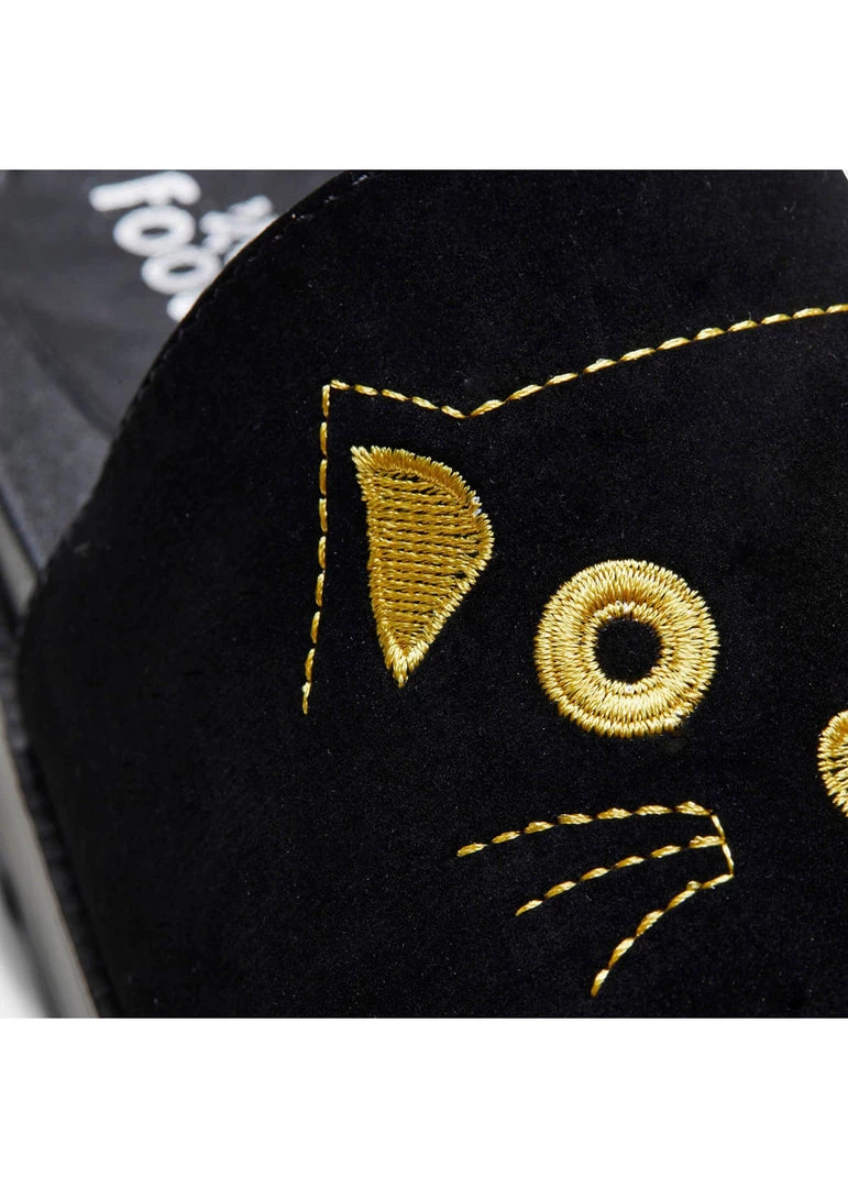 Every step you make those embroidered kitty faces are staring back at you! These playful slides are covered in soft faux-suede, making them extremely pettable 😉 The 4,5 cm heel feels amazingly comfortable because of her 3,5 cm thick sole. These cuties are perfect for taking a stroll, or as stylishly convenient ‘let’s pop these on and go’ slides.