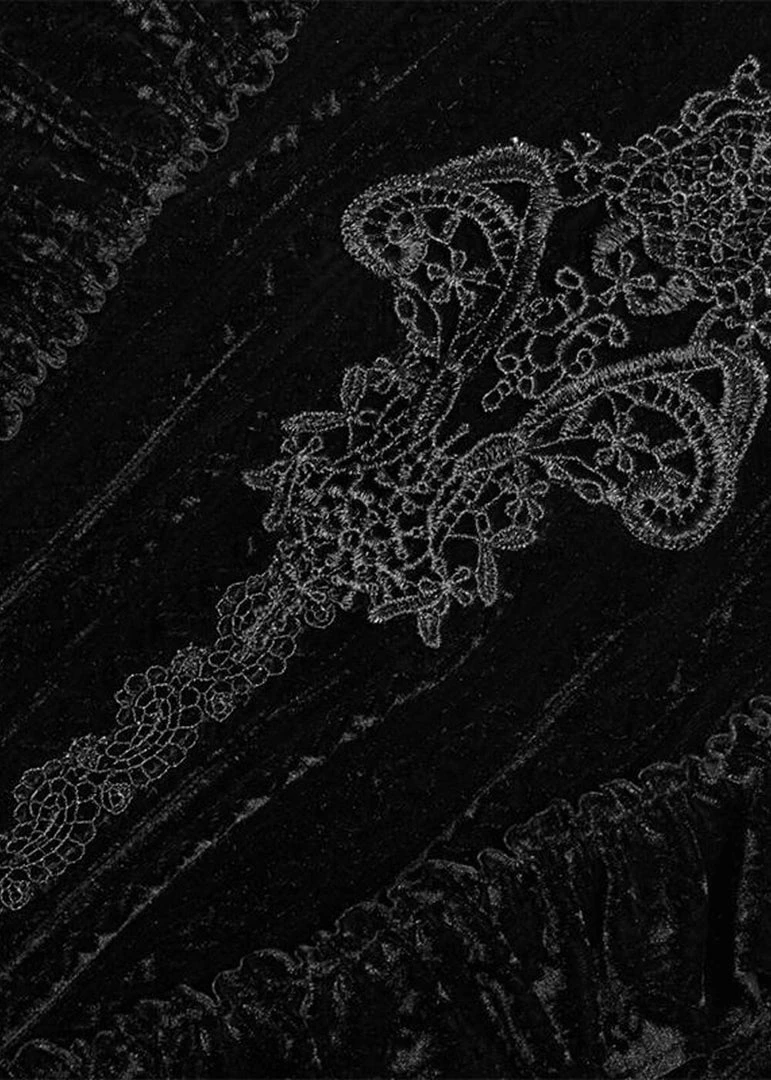 She is loaded with details, from the flaring sleeves with lace to the high collar and the highlight: decadent lace adornments on the v-shape at the bodice…